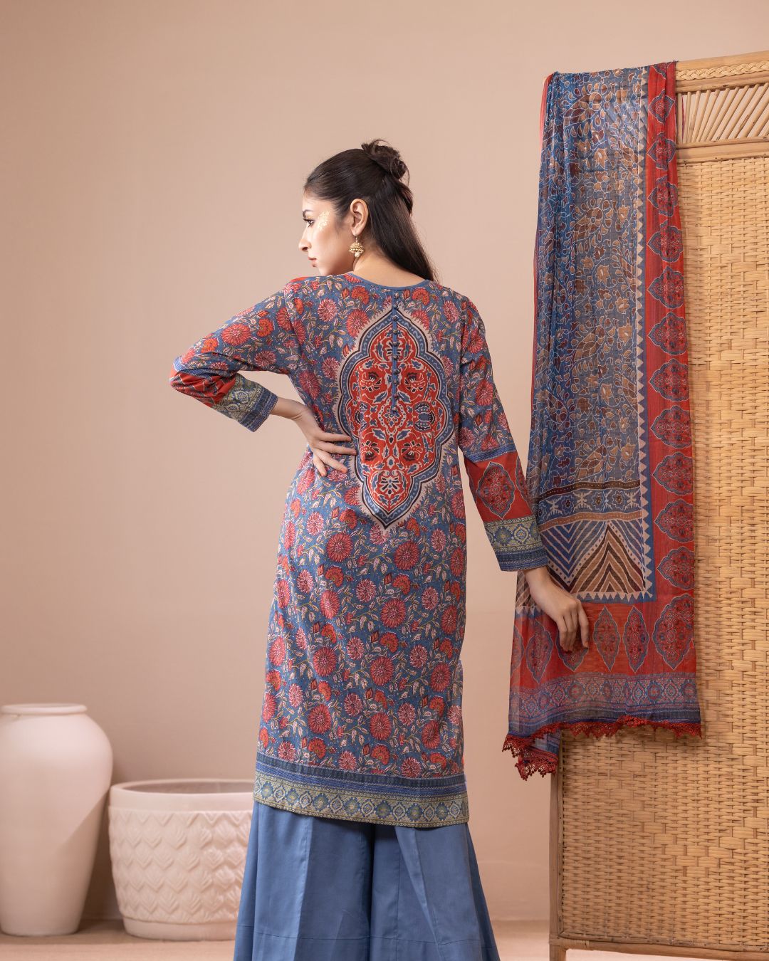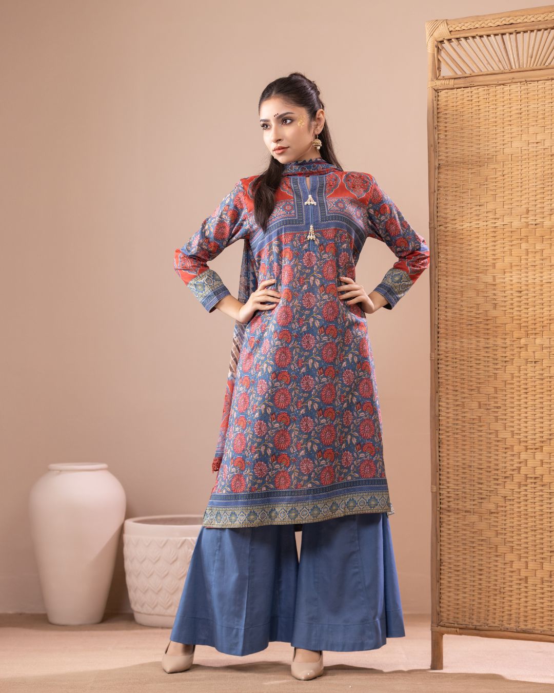Details: Breathable lawn fabric set featuring a Relaxed-fit, long kameez, Kali pant with flare, and a soft chiffon dupatta.