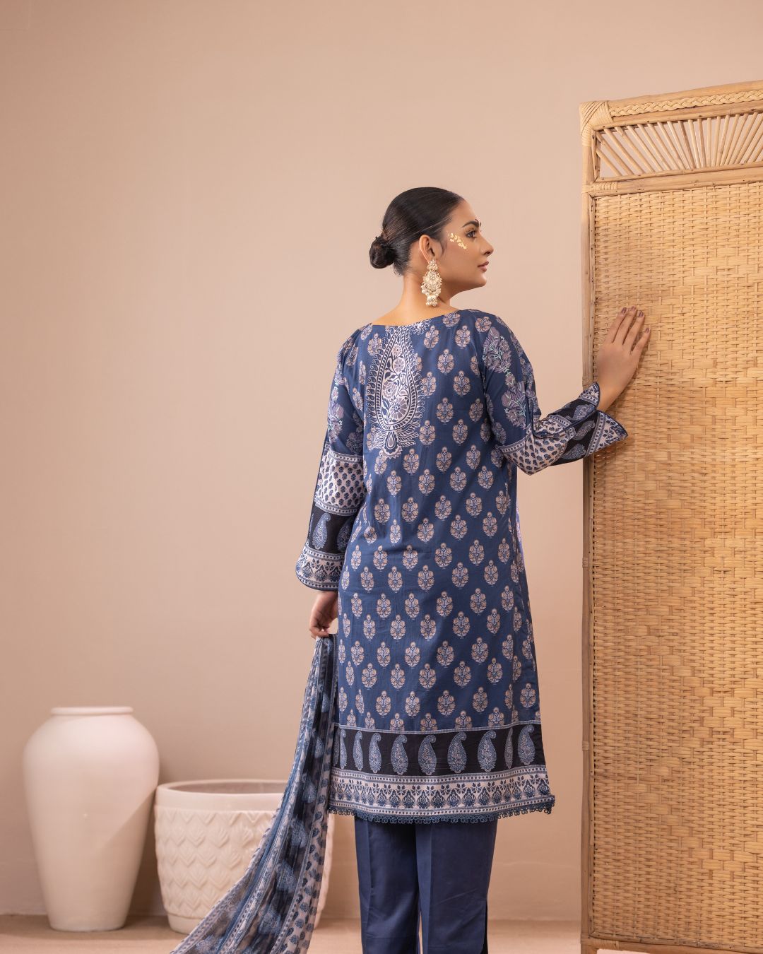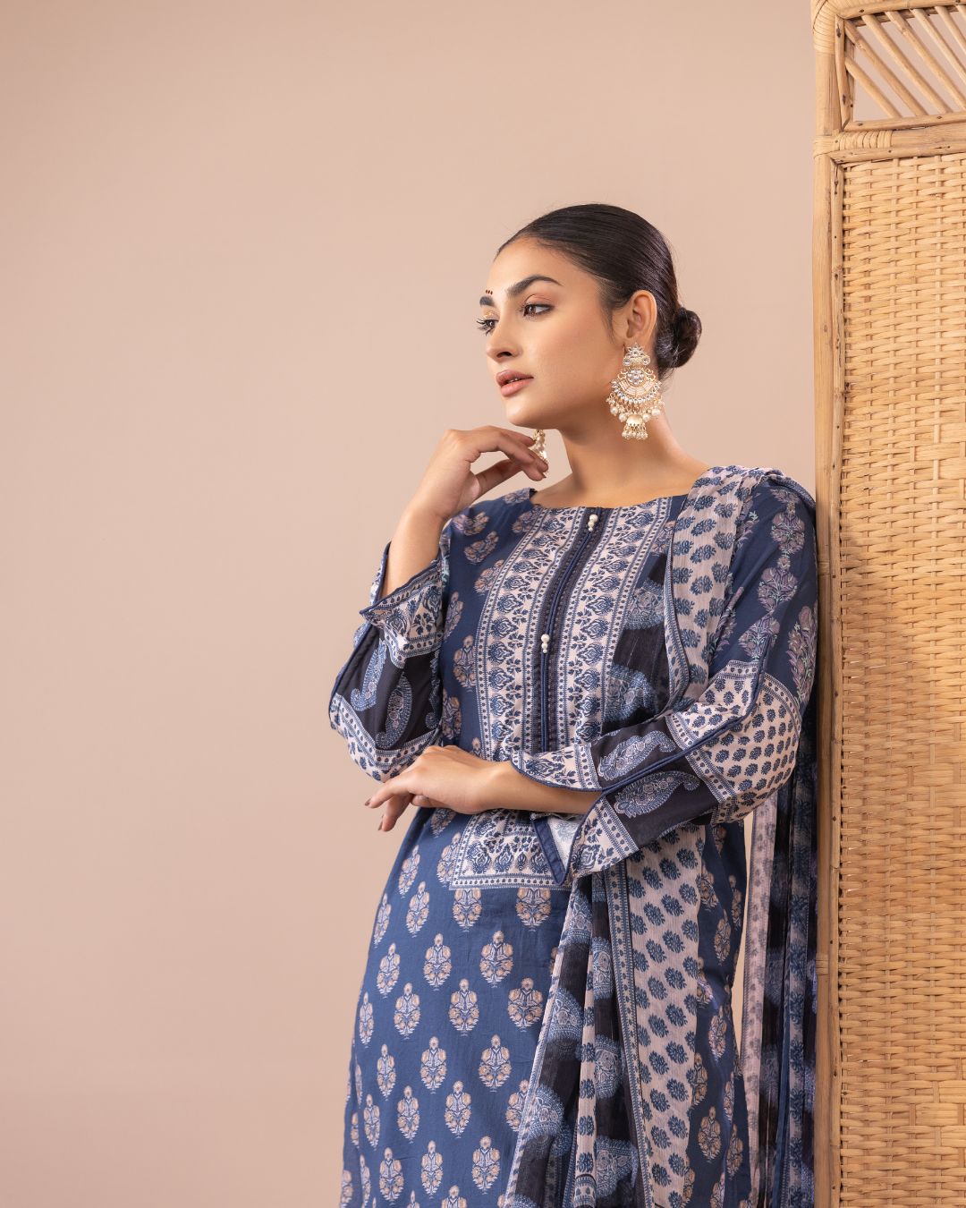 Details: An elevated lawn ensemble with a regular-fit Long kameez, modern side-cut pant, and a graceful chiffon dupatta.