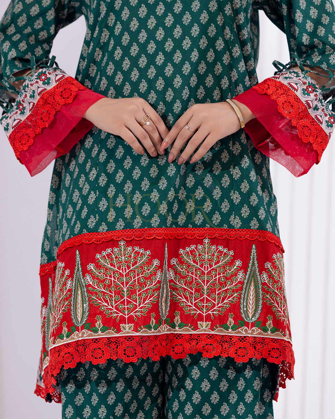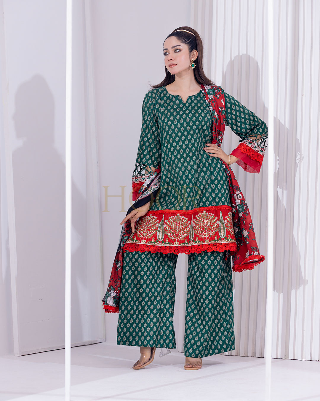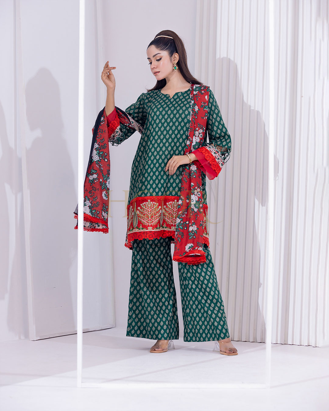 Printed Lawn Shirt with Embroidery Patch Printed Dupatta & Printed Cotton Trouser.
