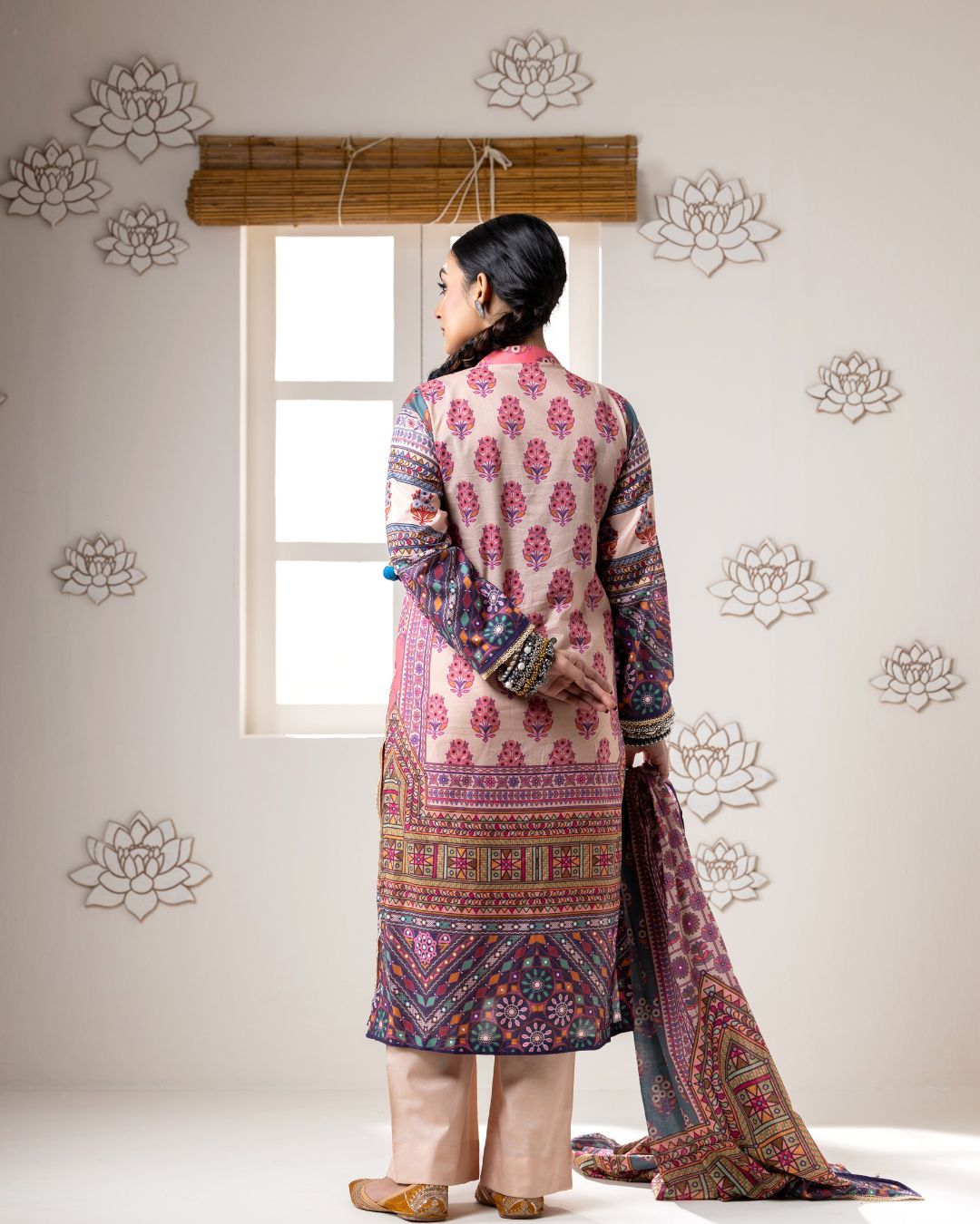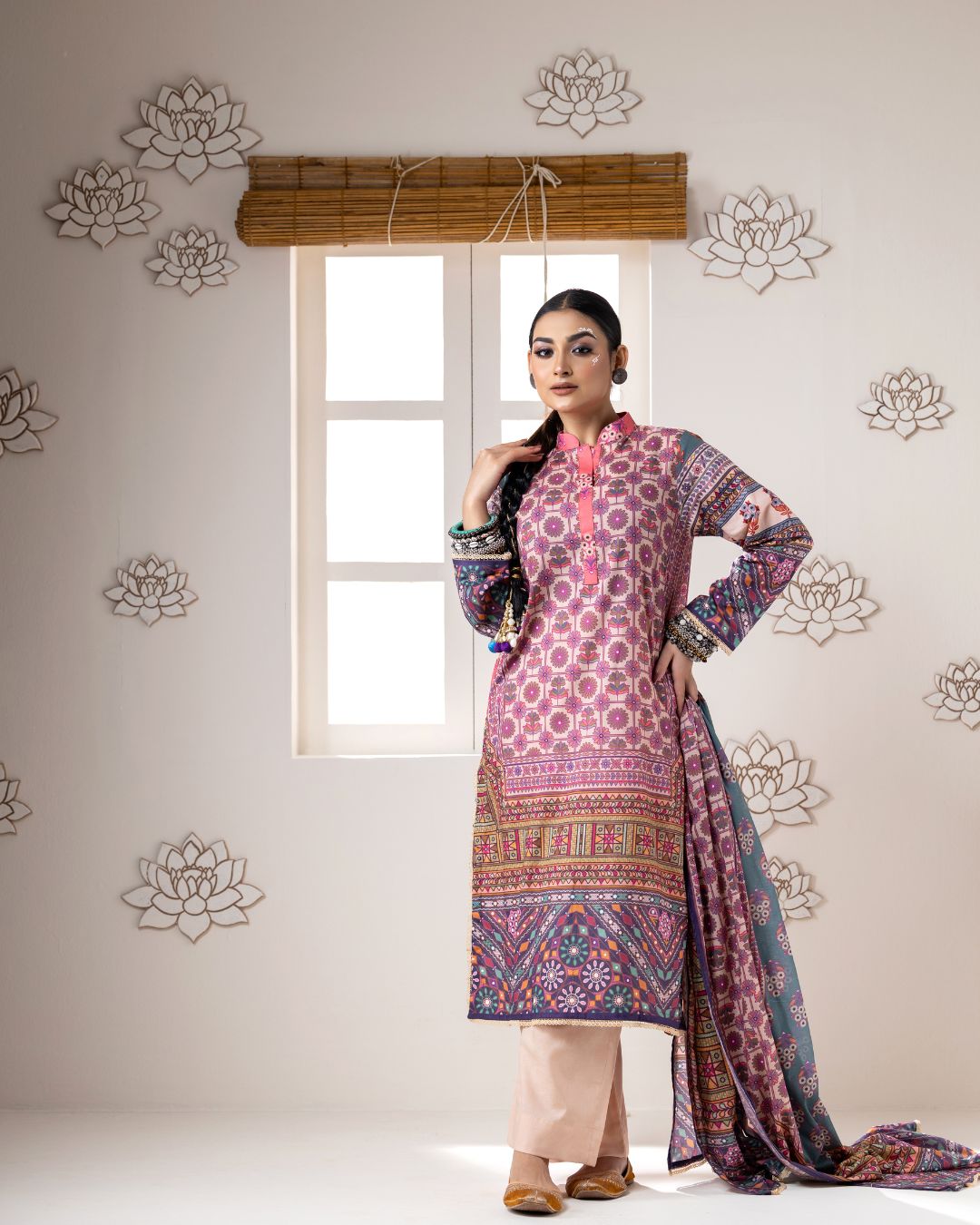 Details: Regular kali kameez paired with wide straight pants, offering a graceful silhouette with modern comfort and effortless elegance.
