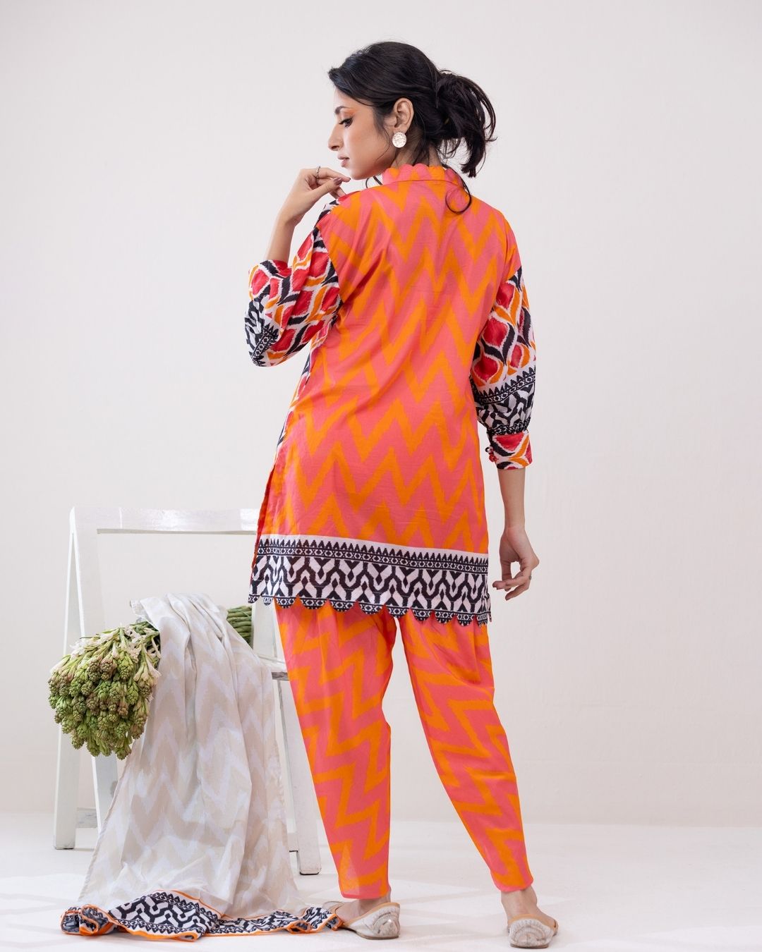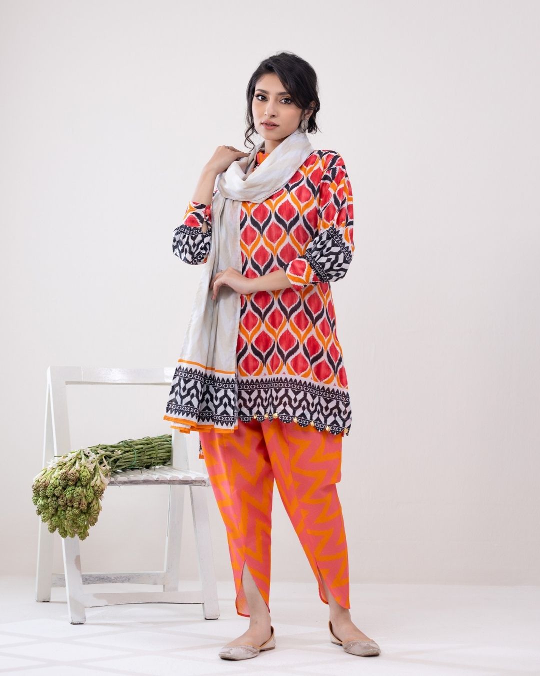 Details: A modern lawn set digitally printed with bold, eclectic ikat and chevron patterns—striking, chic, and effortlessly stylish. Designed with a short drop-shoulder kameez, tulip pants, and a soft lawn dupatta.