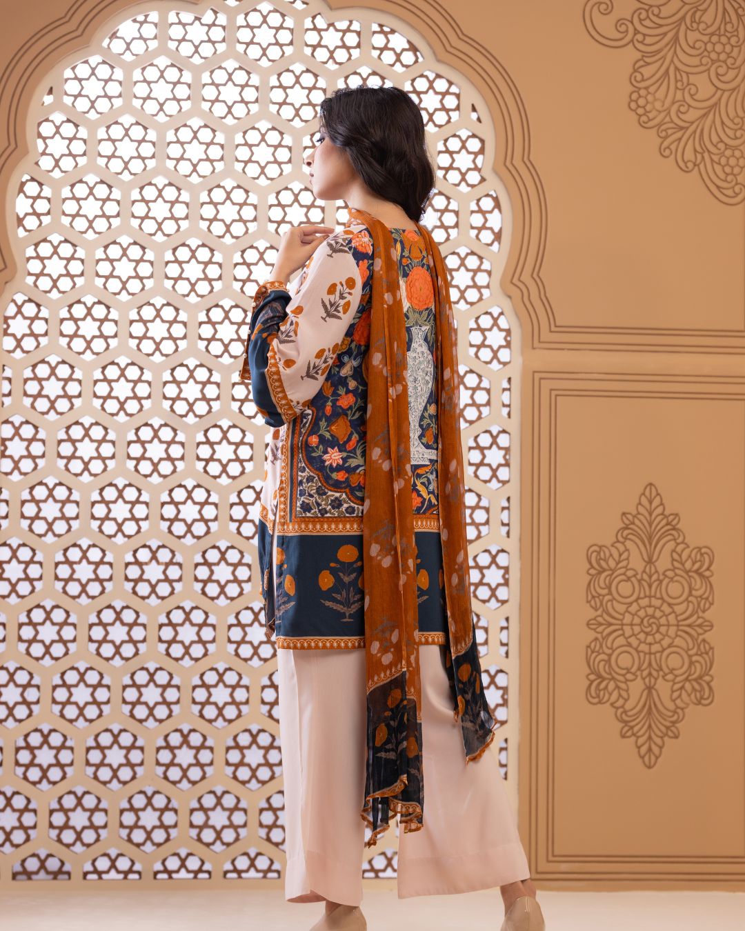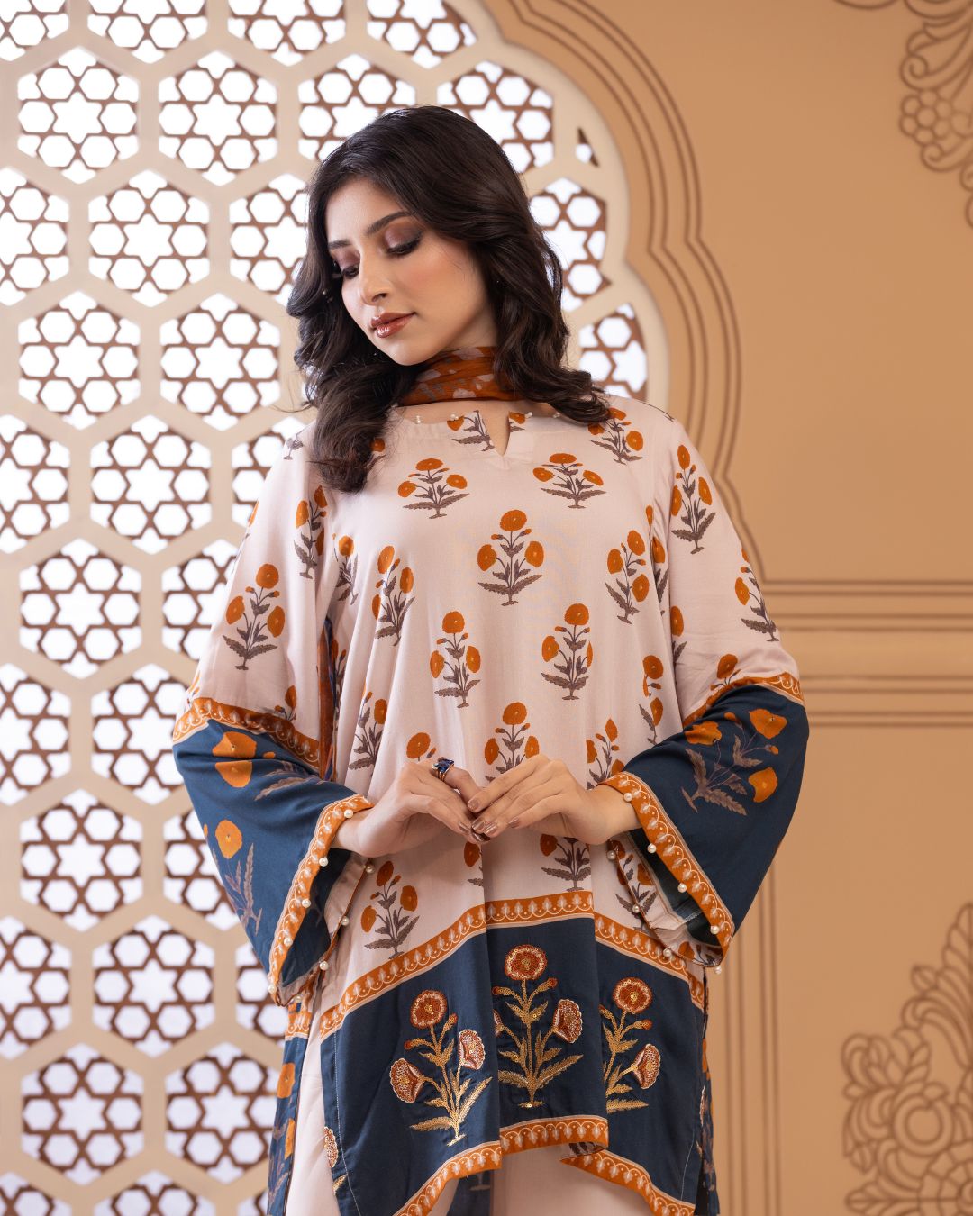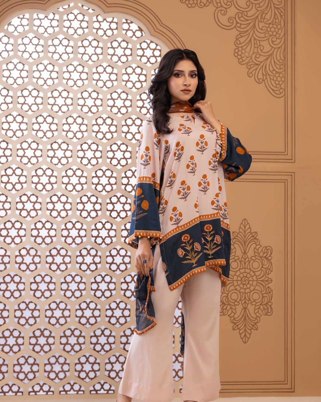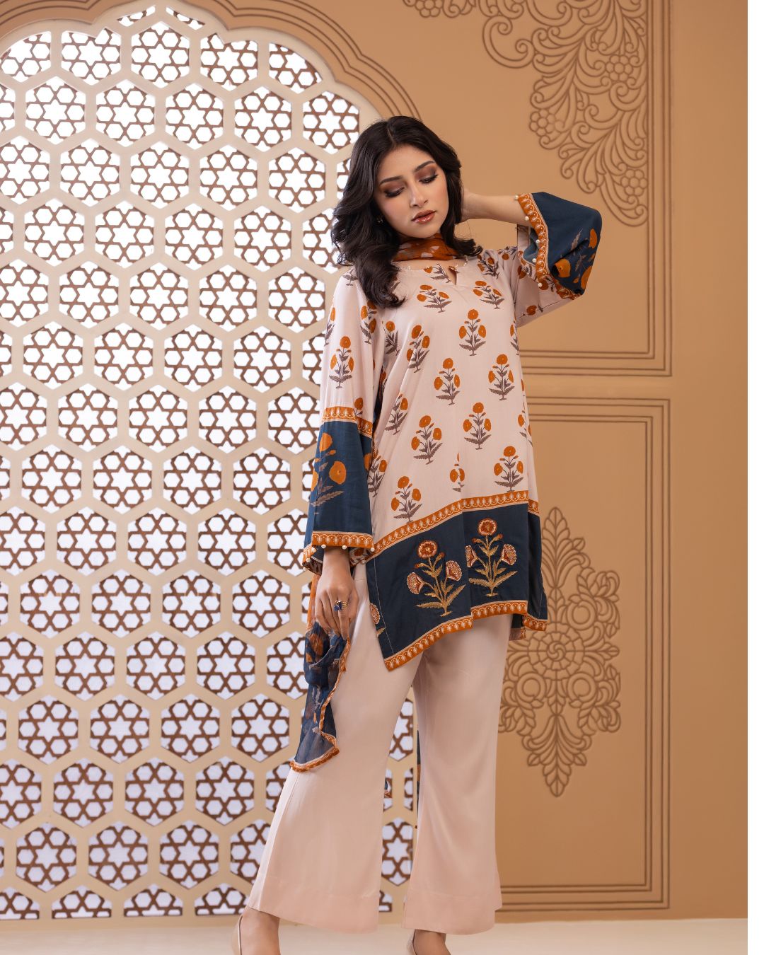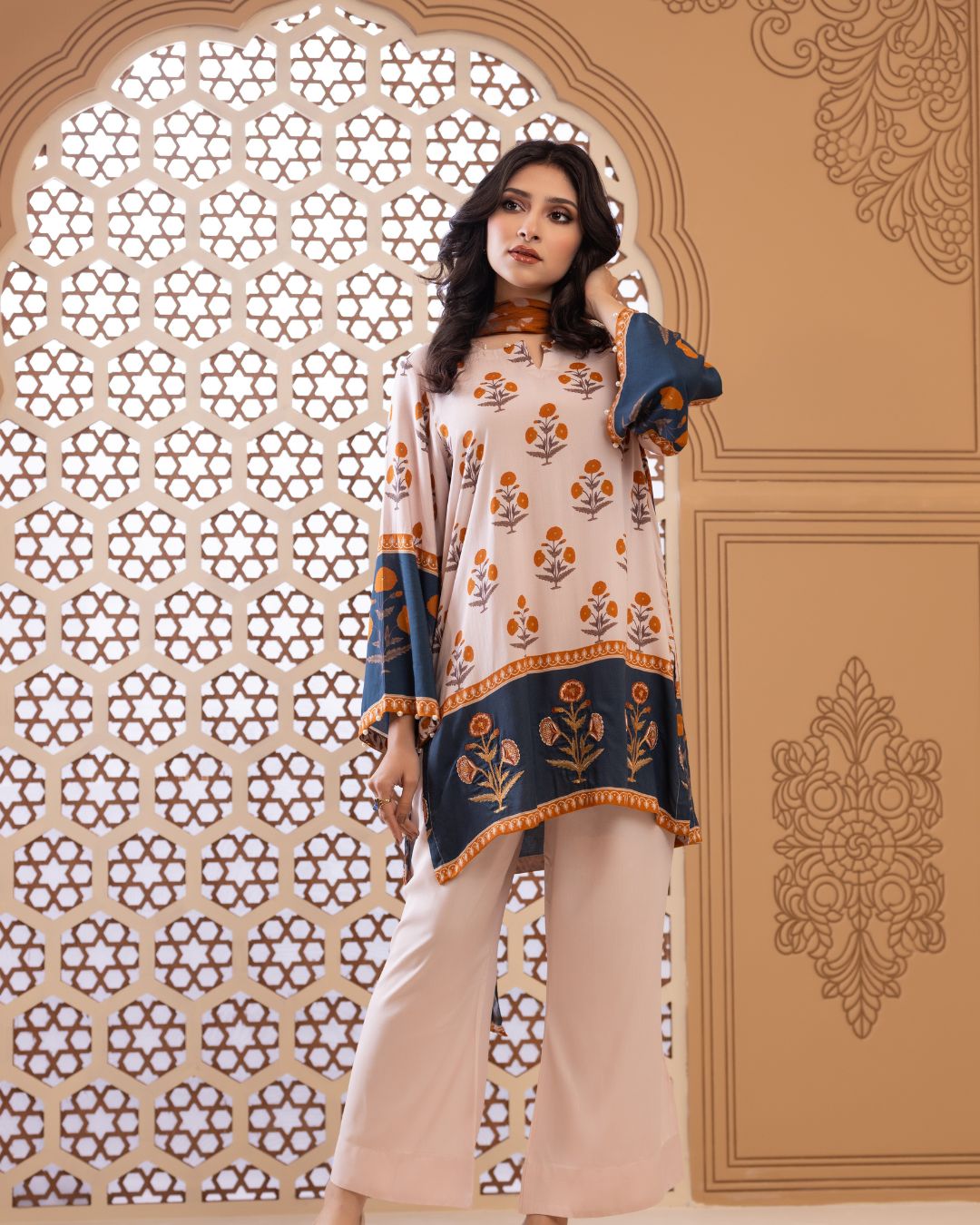 Details: Short regular kameez paired with trendy bell-bottom pants, creating a chic and playful look with effortless comfort. Finished with embroidered bunches along the border, this ensemble adds a refined touch—looking effortlessly stylish and contemporary.