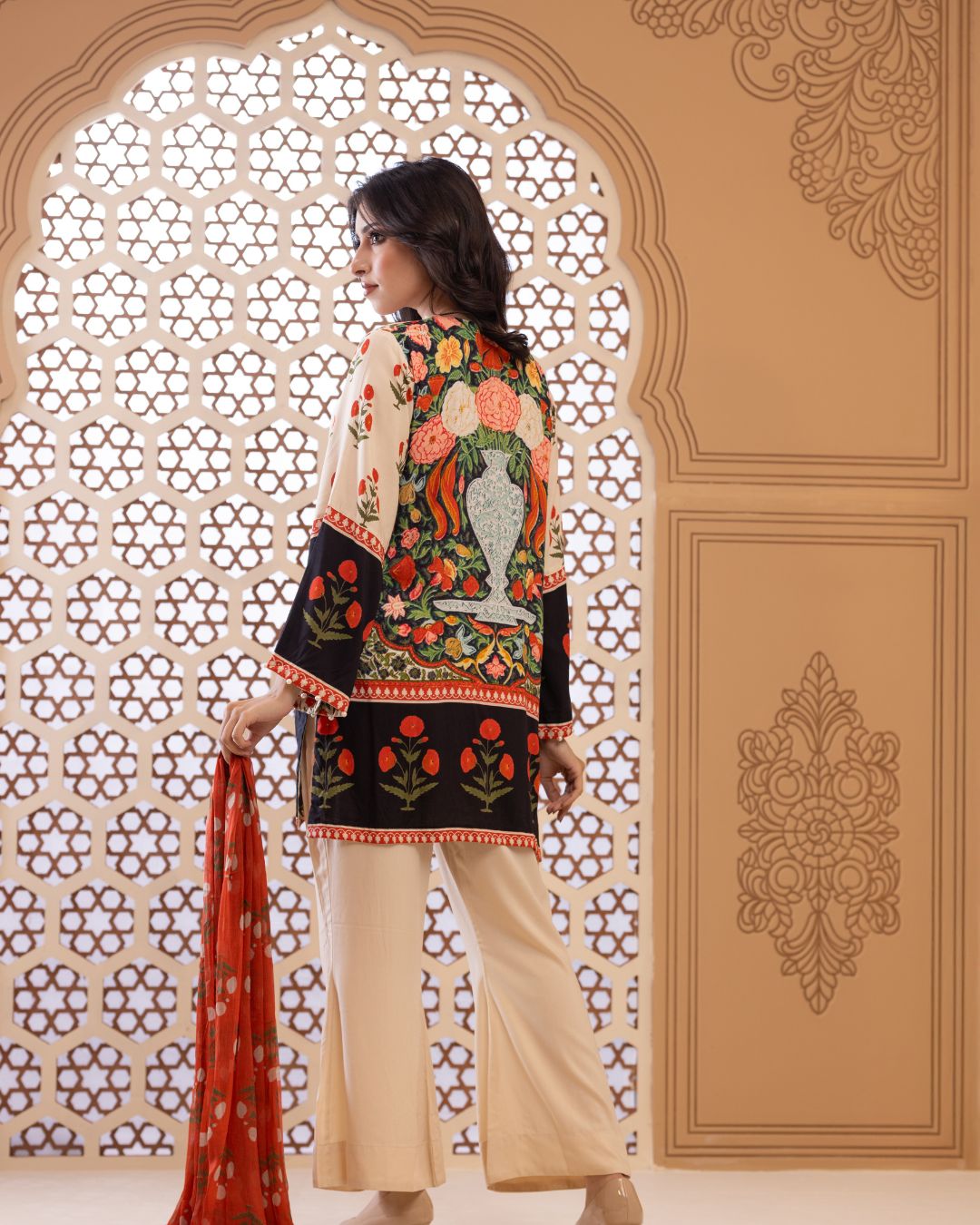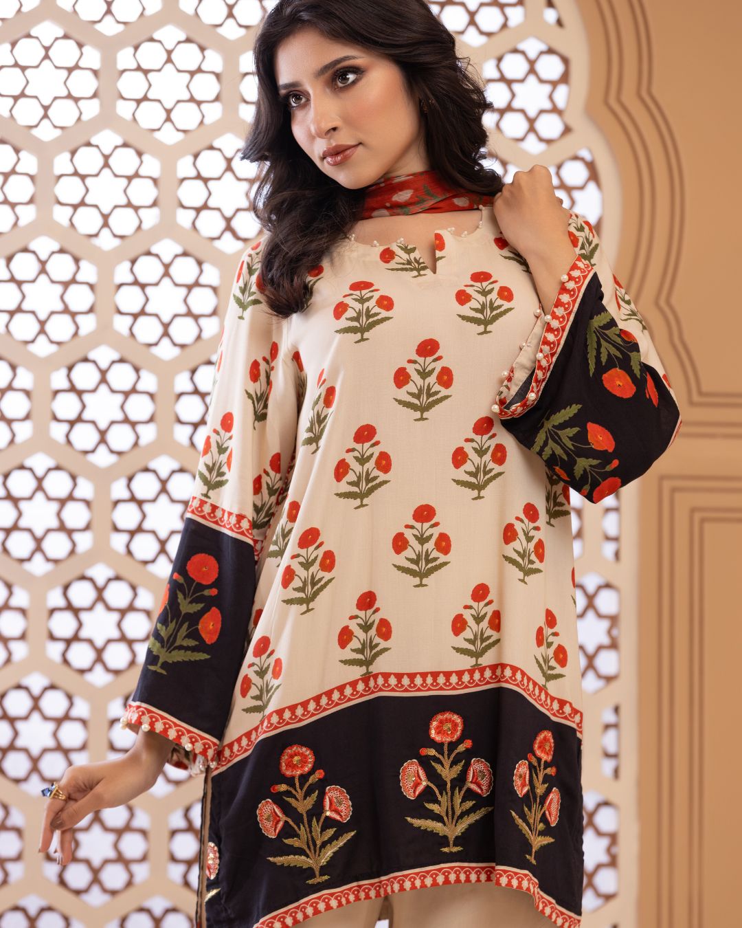 Details: Short regular kameez paired with trendy bell-bottom pants, creating a chic and playful look with effortless comfort. Finished with embroidered bunches along the border, this ensemble adds a refined touch—looking effortlessly stylish and contemporary.