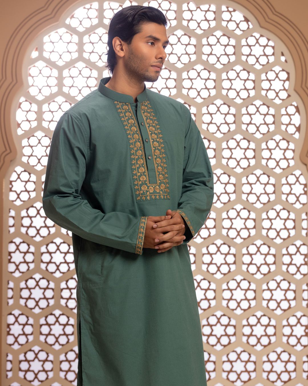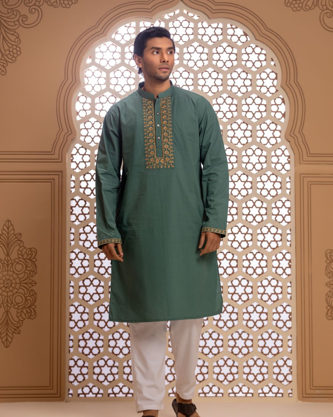 Details: This Panjabi is a perfect blend of tradition and modern minimalism. Crafted for comfort and style, the subtle beige tone paired with intricate detailing makes it an ideal choice for any festive or formal occasion.