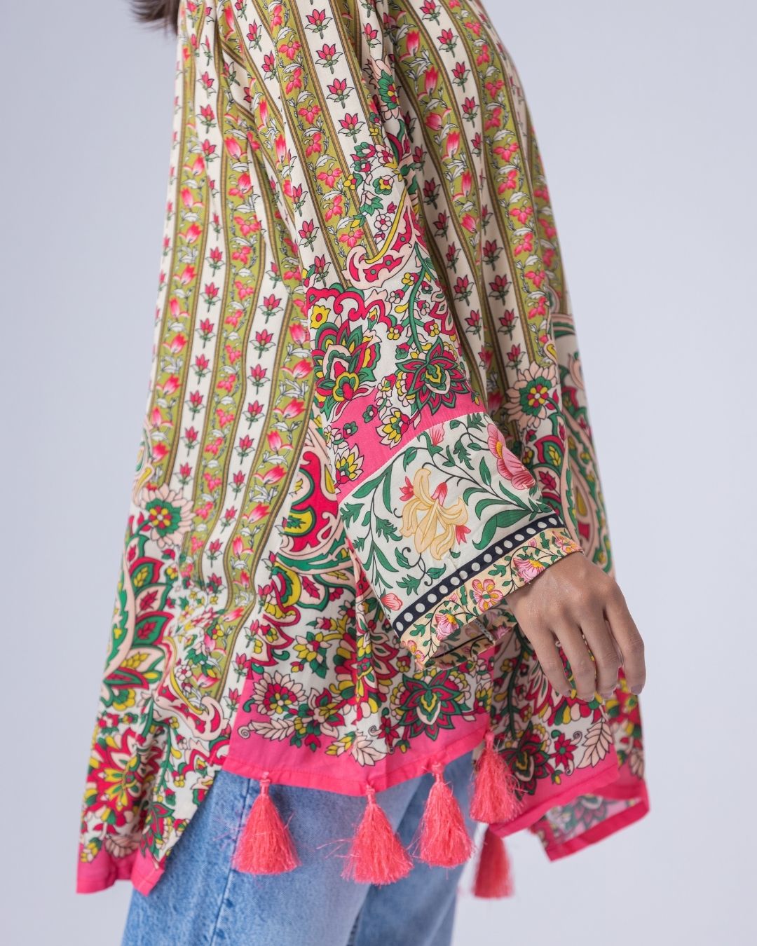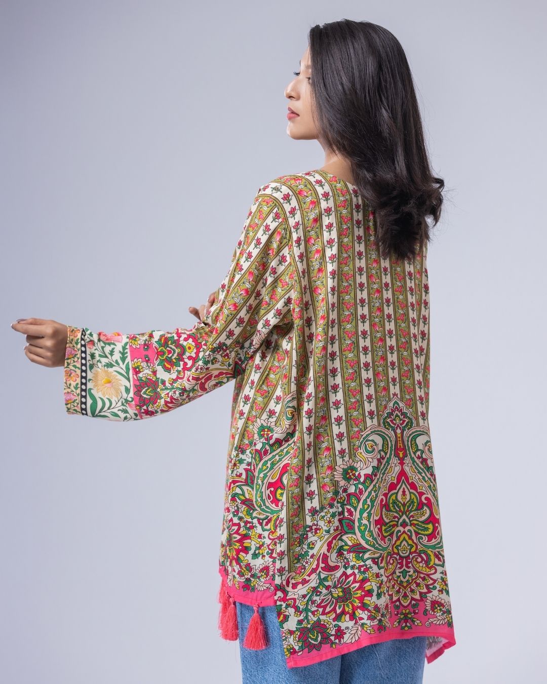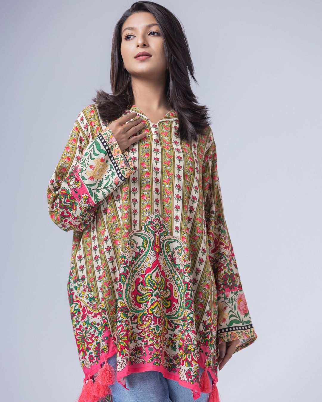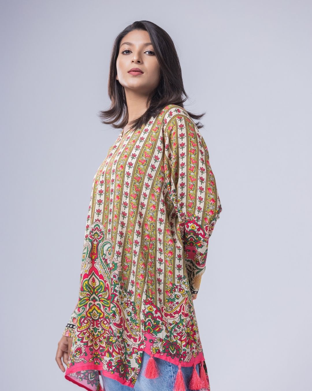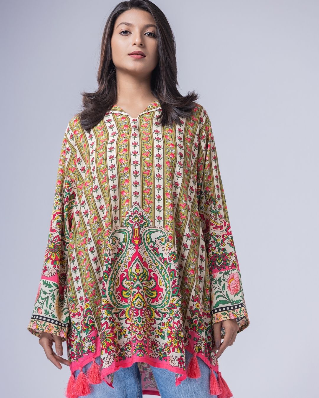 Details: Fun, colorful, cheerful, and bright- this piece blends funky elements to create aesthetically pleasing kurti. Designed to be styled effortlessly with jeans or tights, they bring an easy, casual vibe with a playful edge. Made for ultra-Gen-Z and happy-go-lucky girls and women. With resort collars, separate side panels, and long flowy tassels that add movement and a fun, lively look.