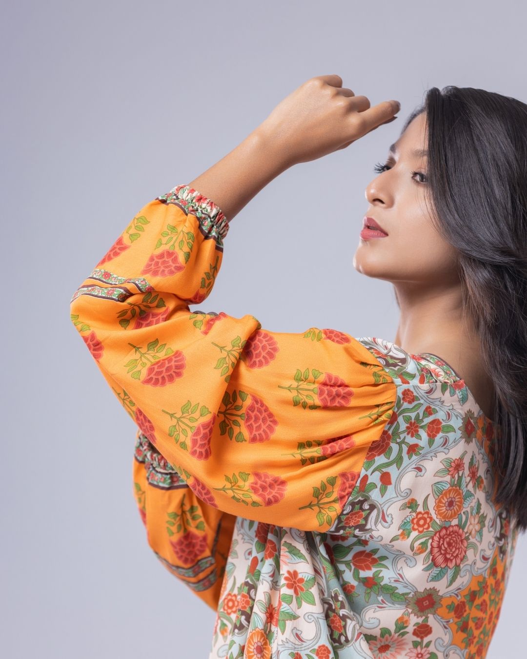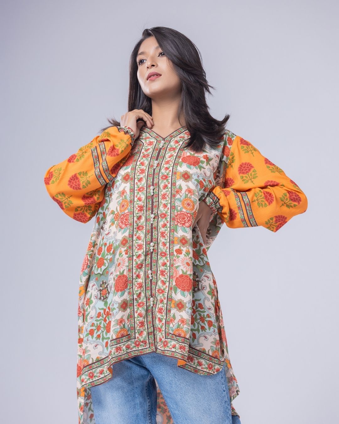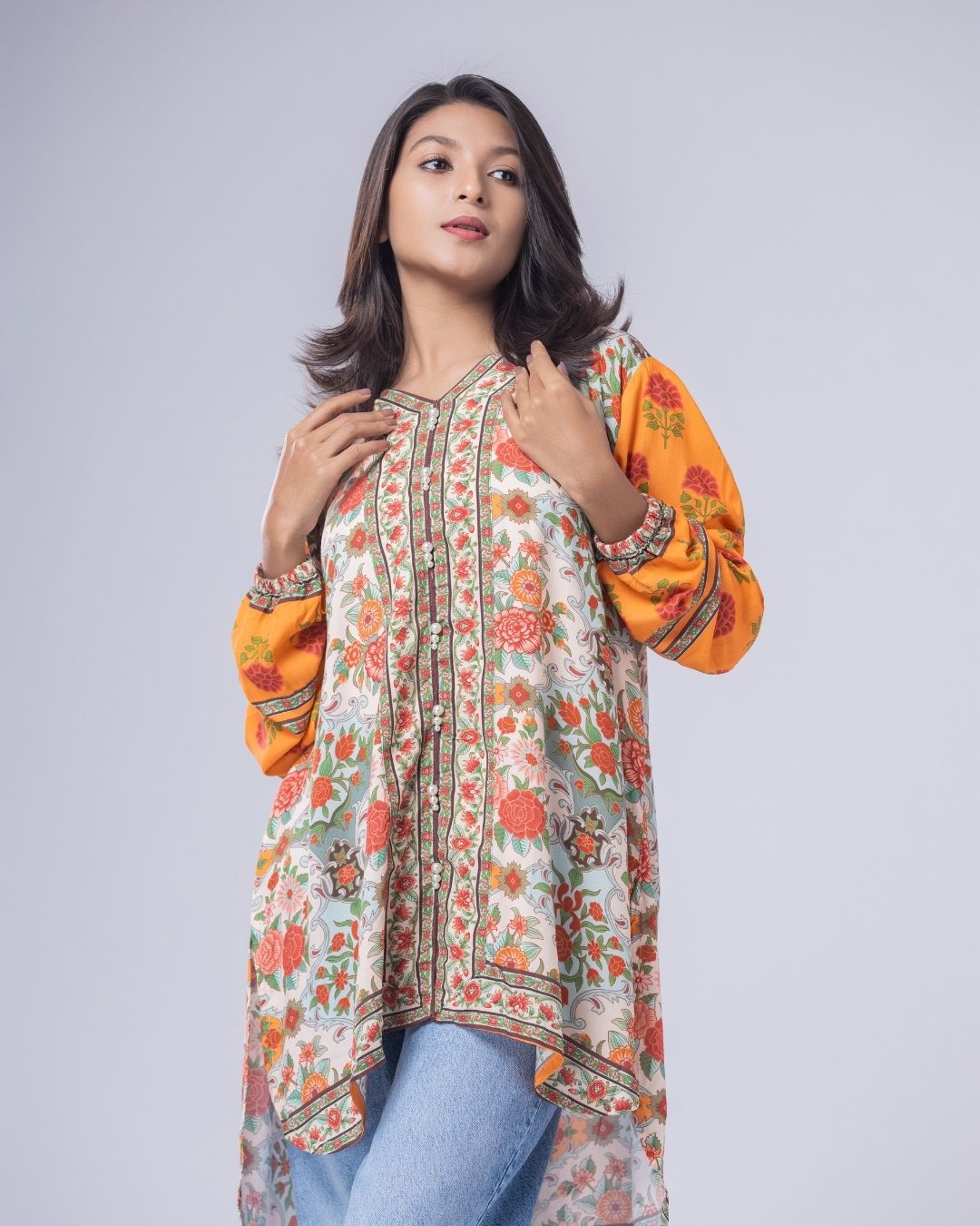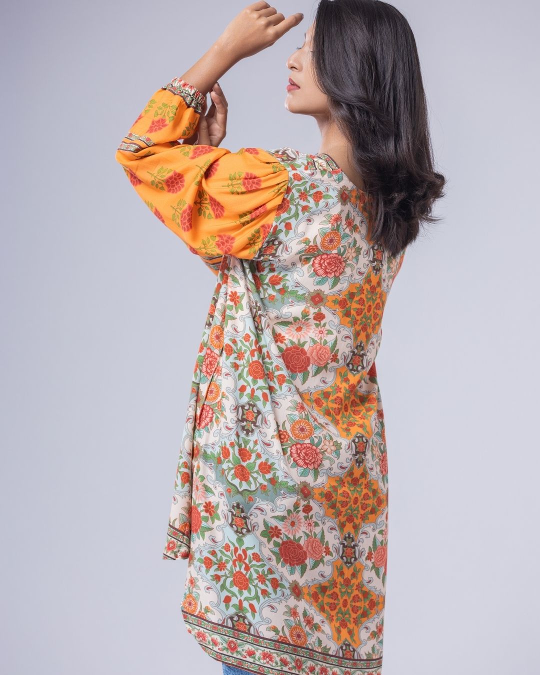 Details: A loose-fit, front-open short kurta with gathered sleeves, designed in fun, funky colors for a playful statement. Featuring a shorter front with a longer back, delicate pearly detailing, and a flattering V-neckline. Easy, modern, and perfect for a casual yet standout look.