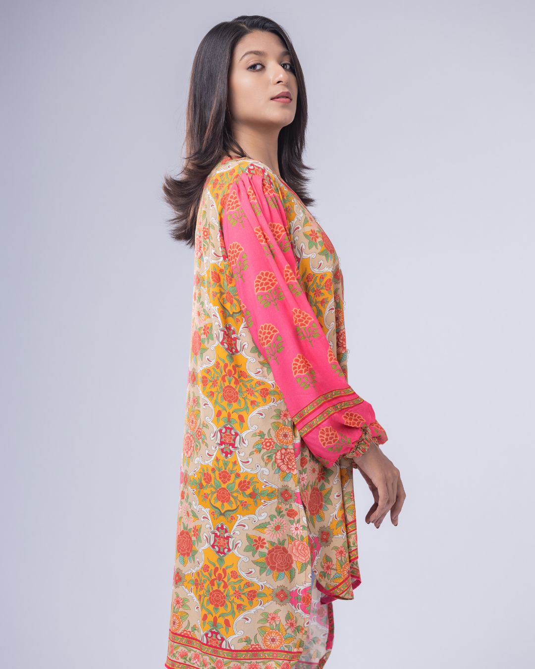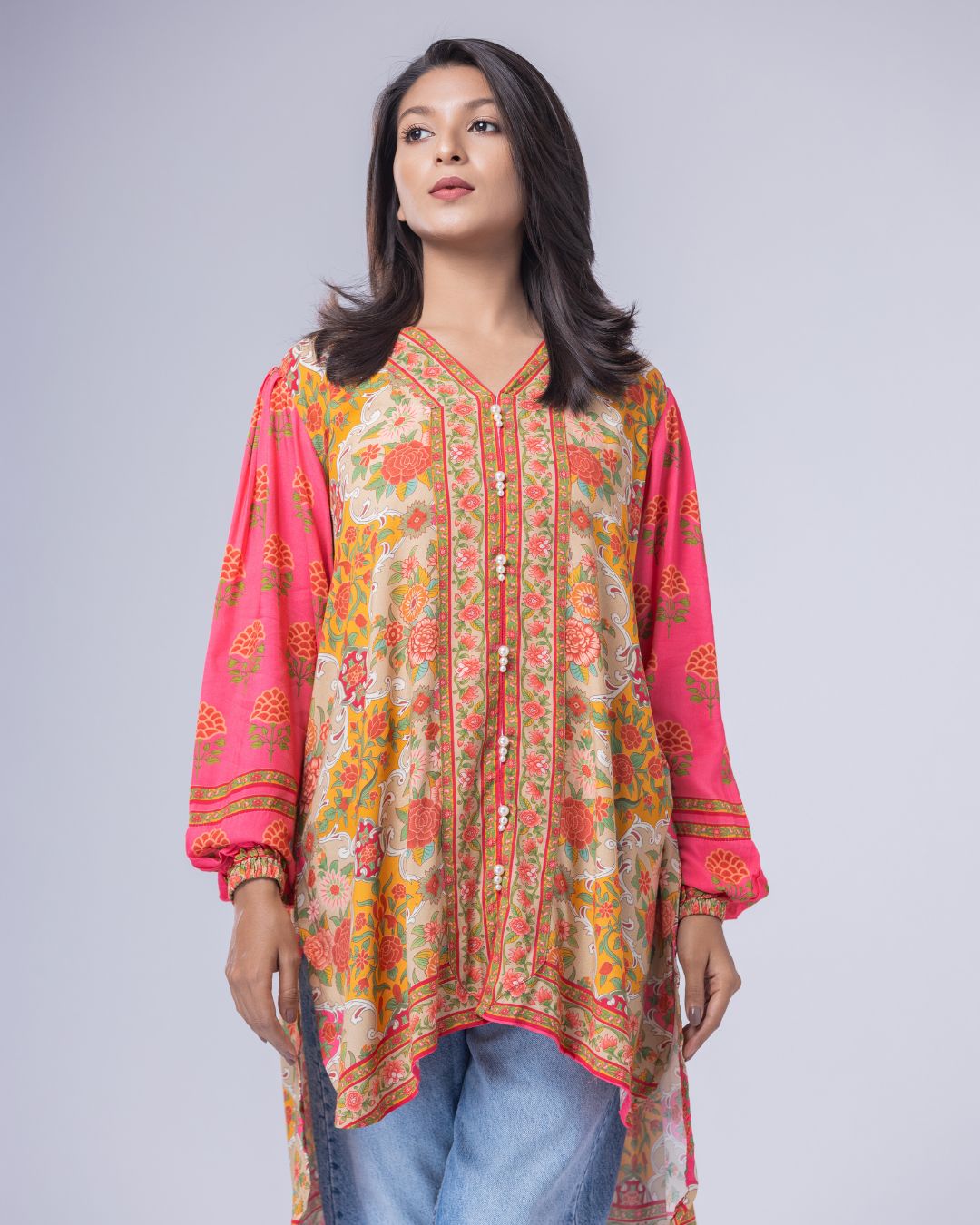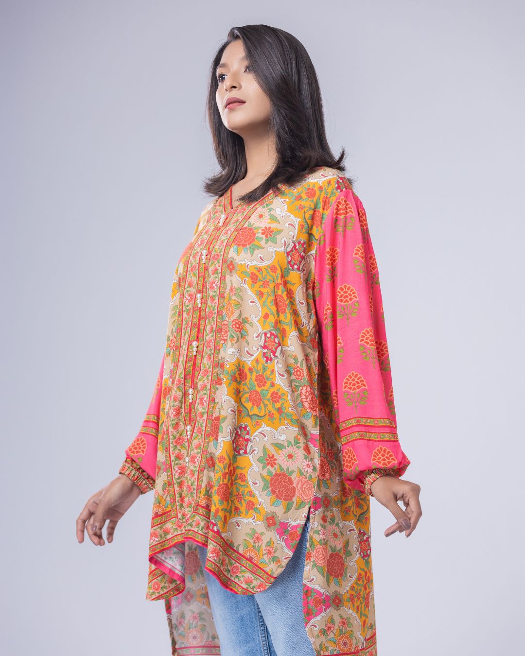 Details: A loose-fit, front-open short kurta with gathered sleeves, designed in fun, funky colors for a playful statement. Featuring a shorter front with a longer back, delicate pearly detailing, and a flattering V-neckline. Easy, modern, and perfect for a casual yet standout look.