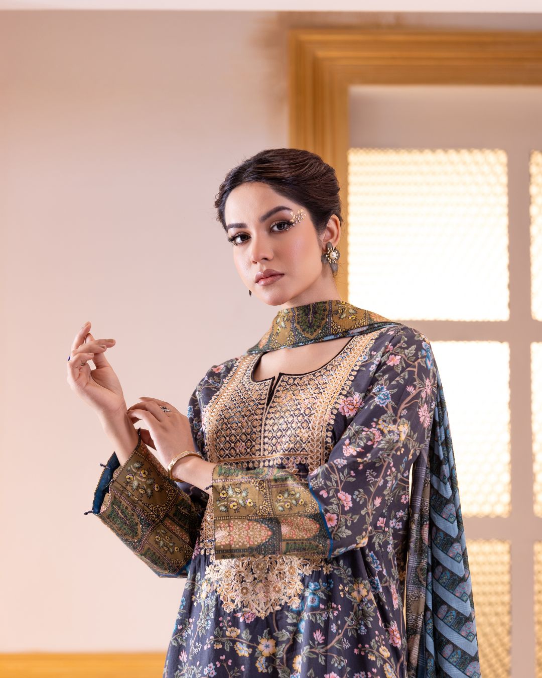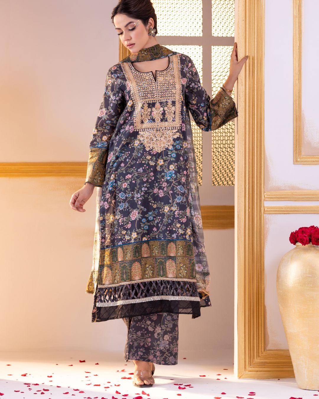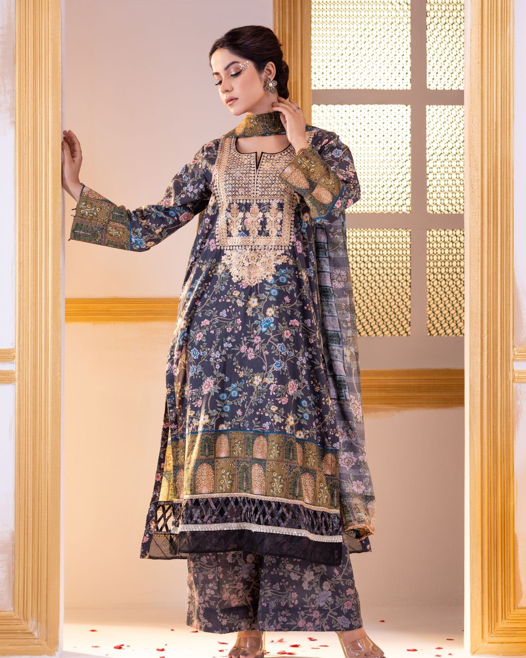 Details: A regular-fit kameez paired with straight flare pants, offering the perfect blend of classic elegance and modern comfort. Enhanced with refined fabric detailing, delicate organza accents, and intricately studded lace finishes that add depth, texture, and a sophisticated festive charm.