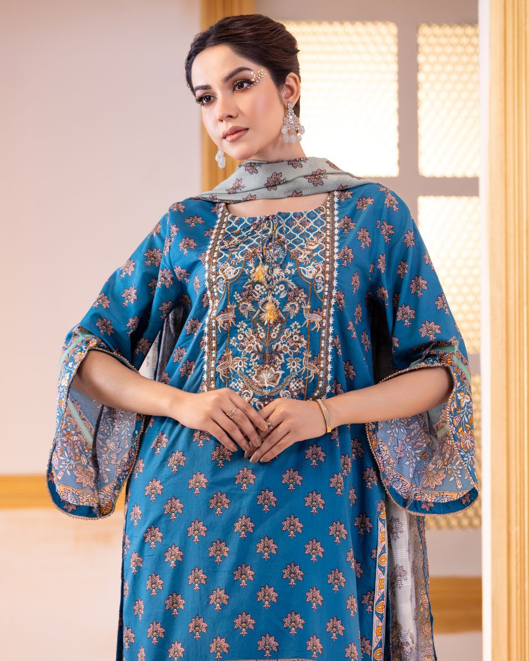 Details: A regular-fit kameez paired with straight pants, designed for a timeless silhouette that offers everyday comfort with effortless elegance. Finished with organza borders delicately pinned with pearls and enhanced with studded lace accents, giving the outfit a rich and refined look.