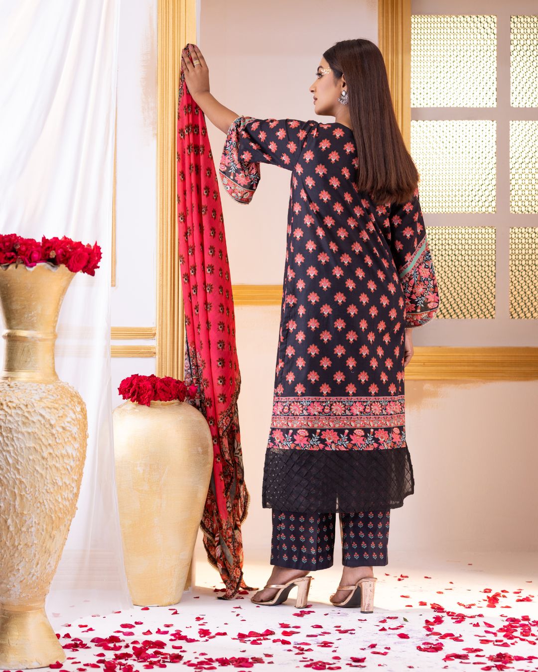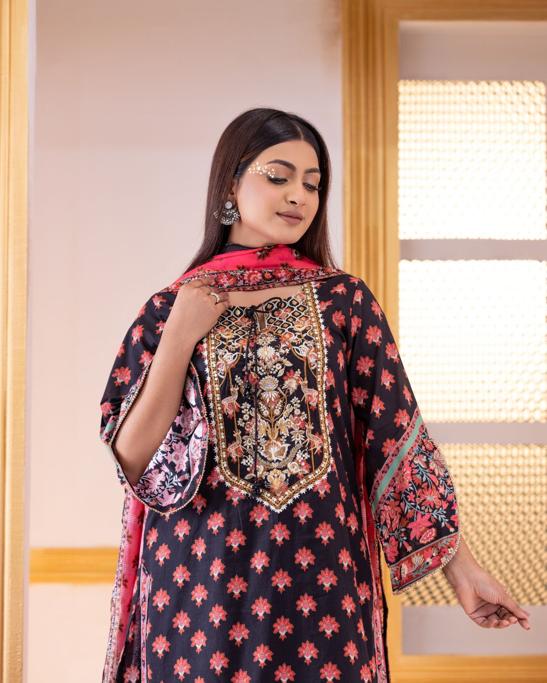Details: A regular-fit kameez paired with straight pants, designed for a timeless silhouette that offers everyday comfort with effortless elegance. Finished with organza borders delicately pinned with pearls and enhanced with studded lace accents, giving the outfit a rich and refined look.