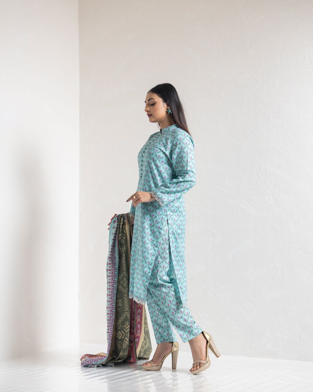 Details: This classic pairing combines a graceful long Kameez with tailored straight pants to deliver a refined, timeless aesthetic.