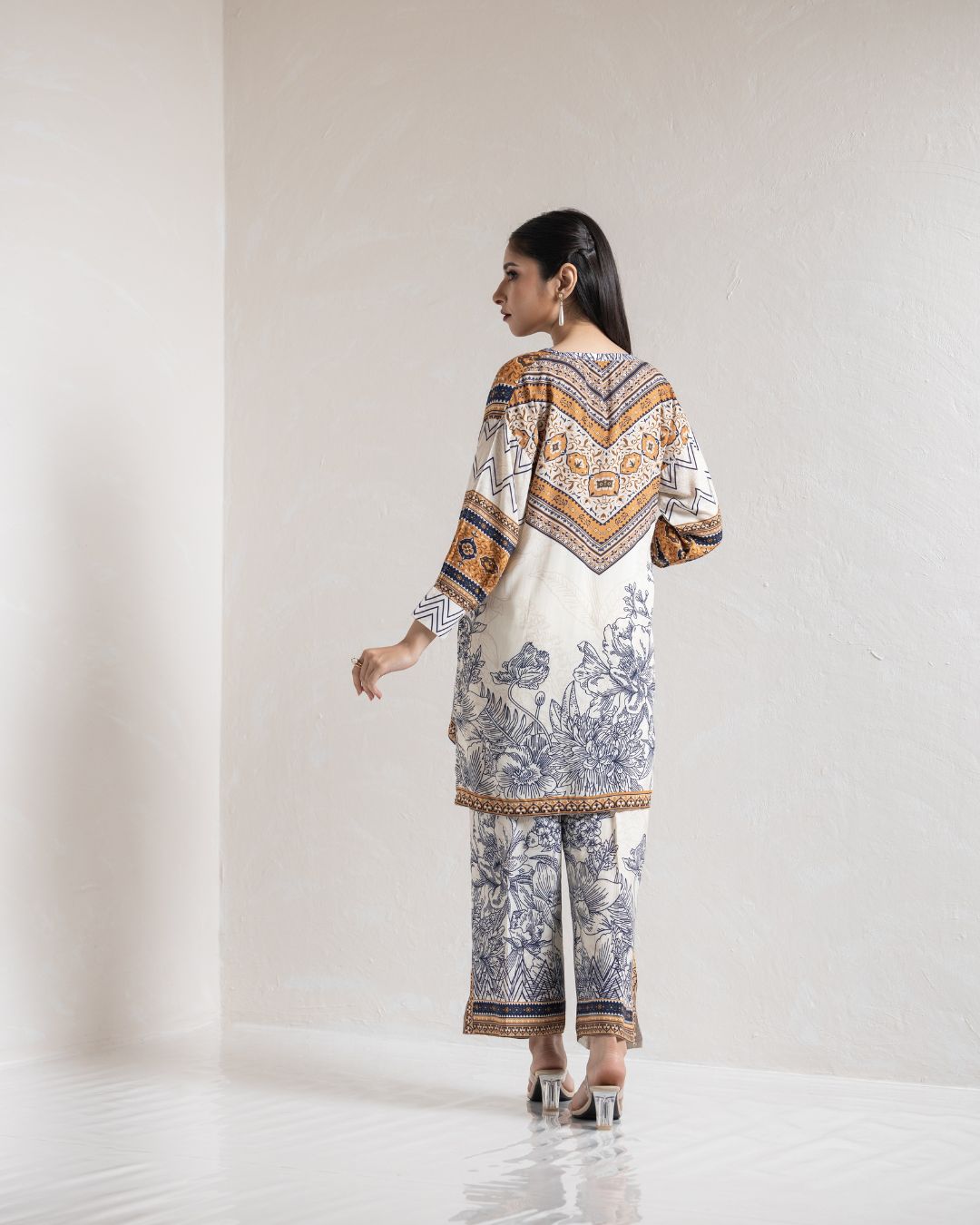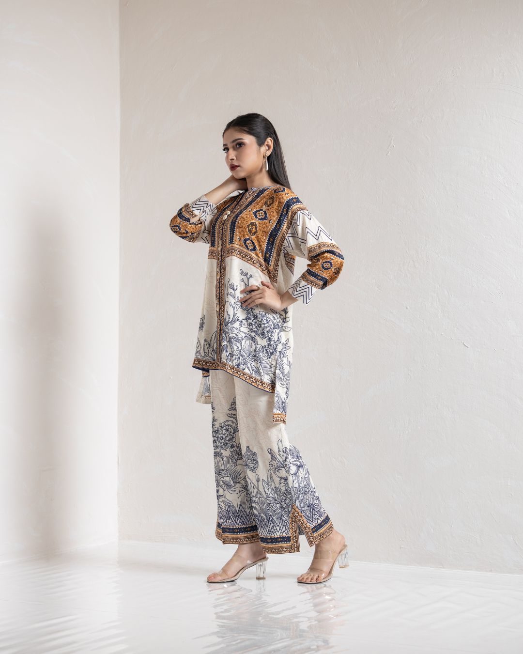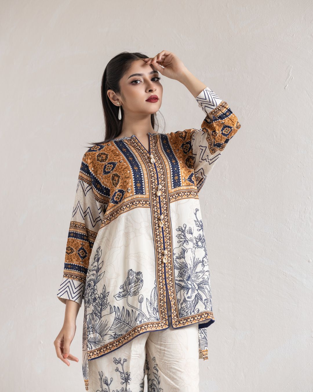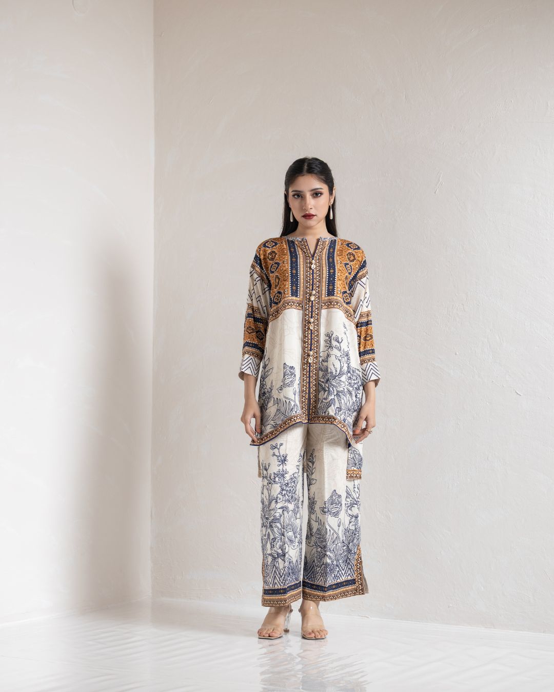 | Kameez: Drop Shoulder Front Open Shirt | Pant: Straight Pant With Slit | |||||