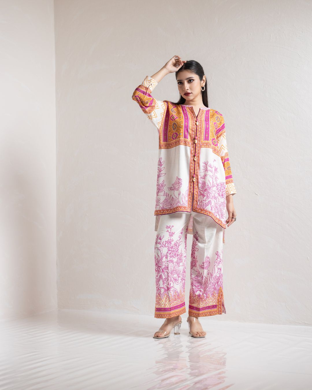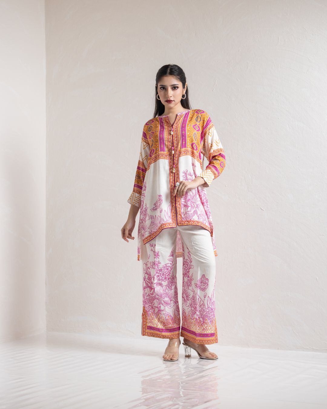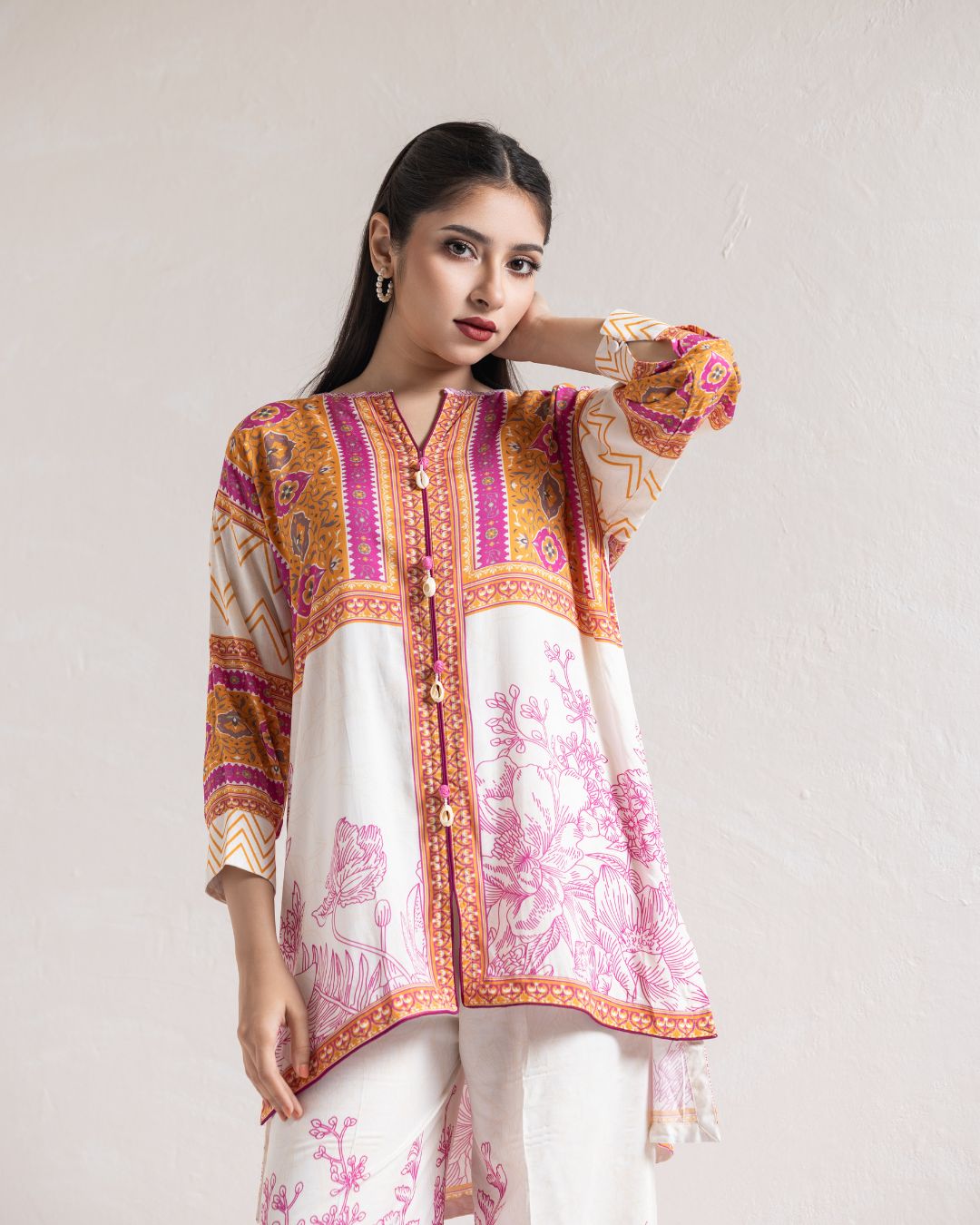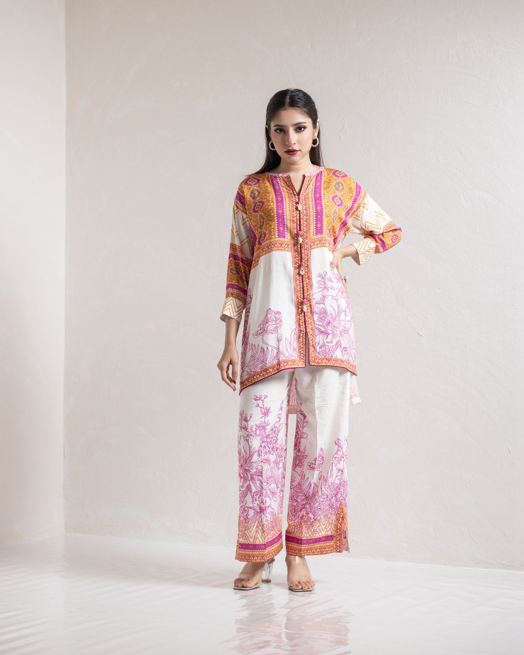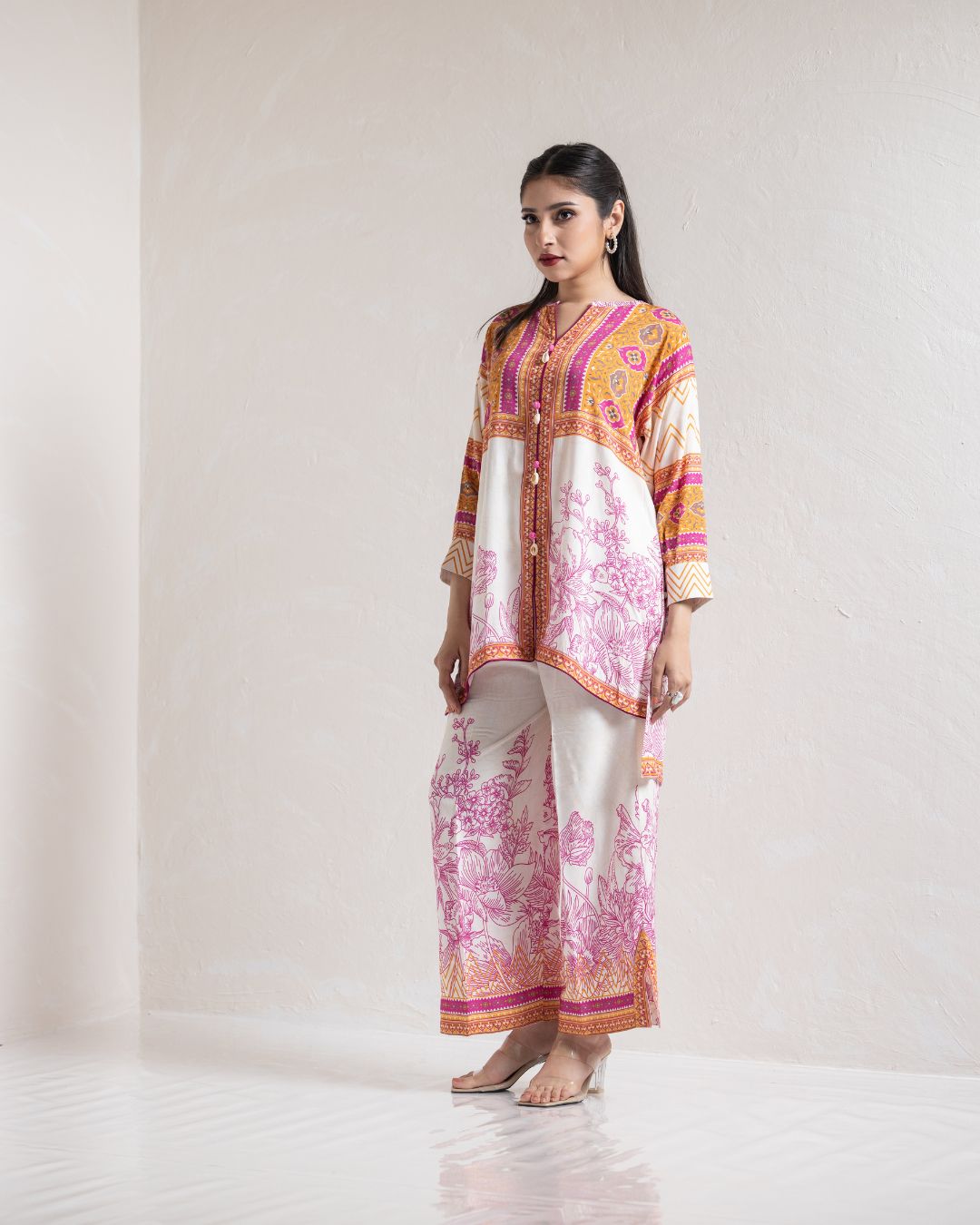 | Kameez: Drop Shoulder Front Open Shirt | Pant: Straight Pant With Slit | |||||