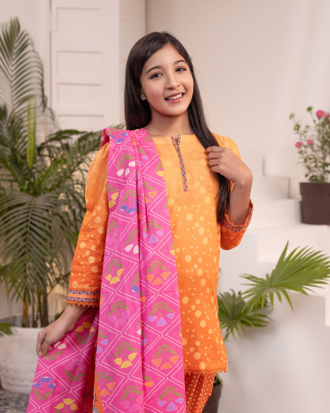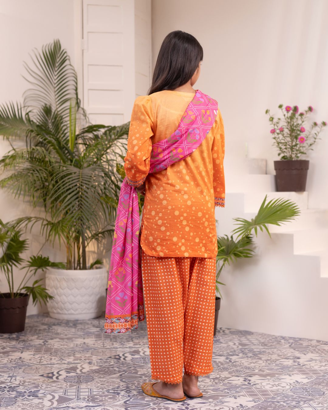 Details: Kameez with a round daman paired with pant shalwar, offering a graceful and traditional silhouette.