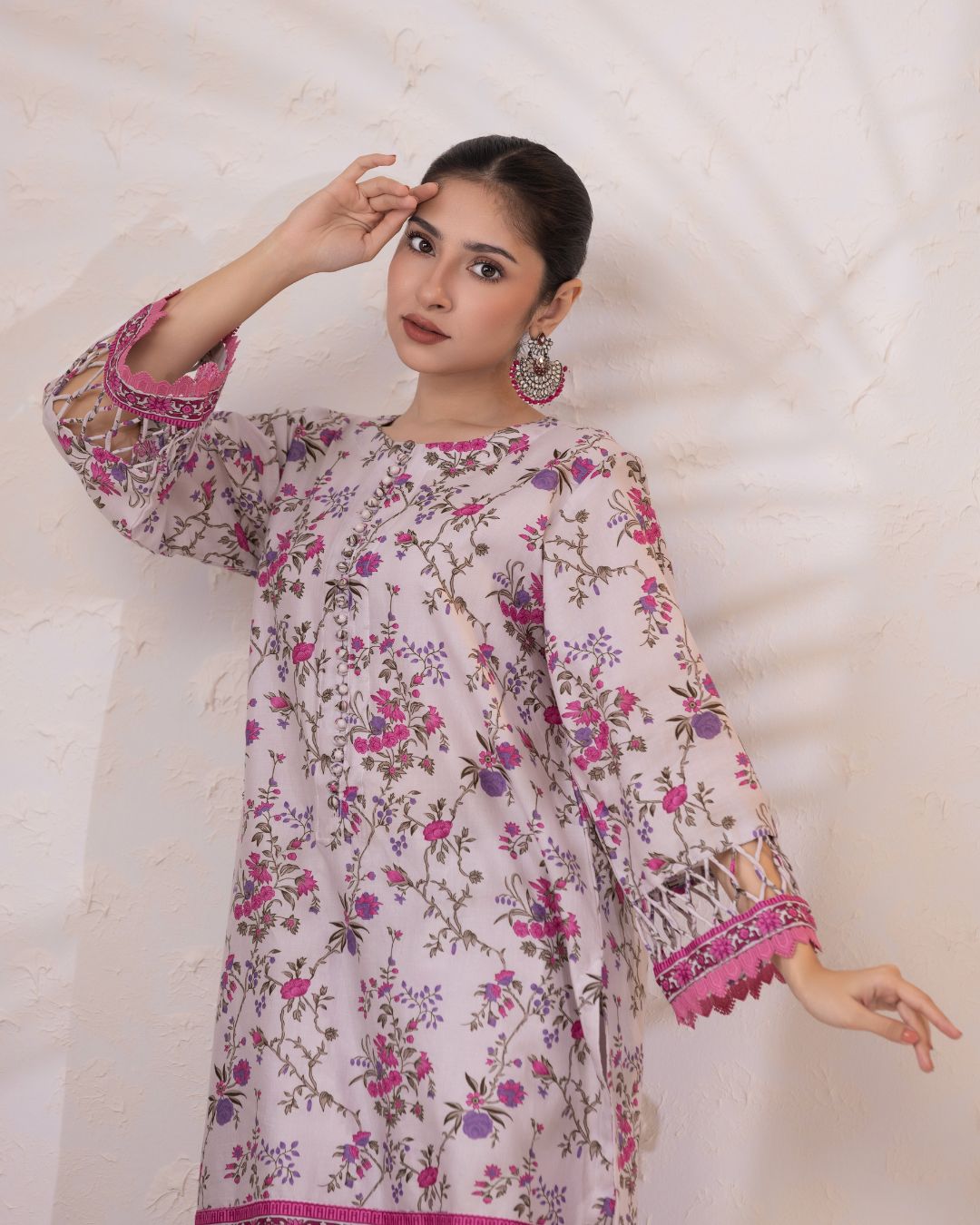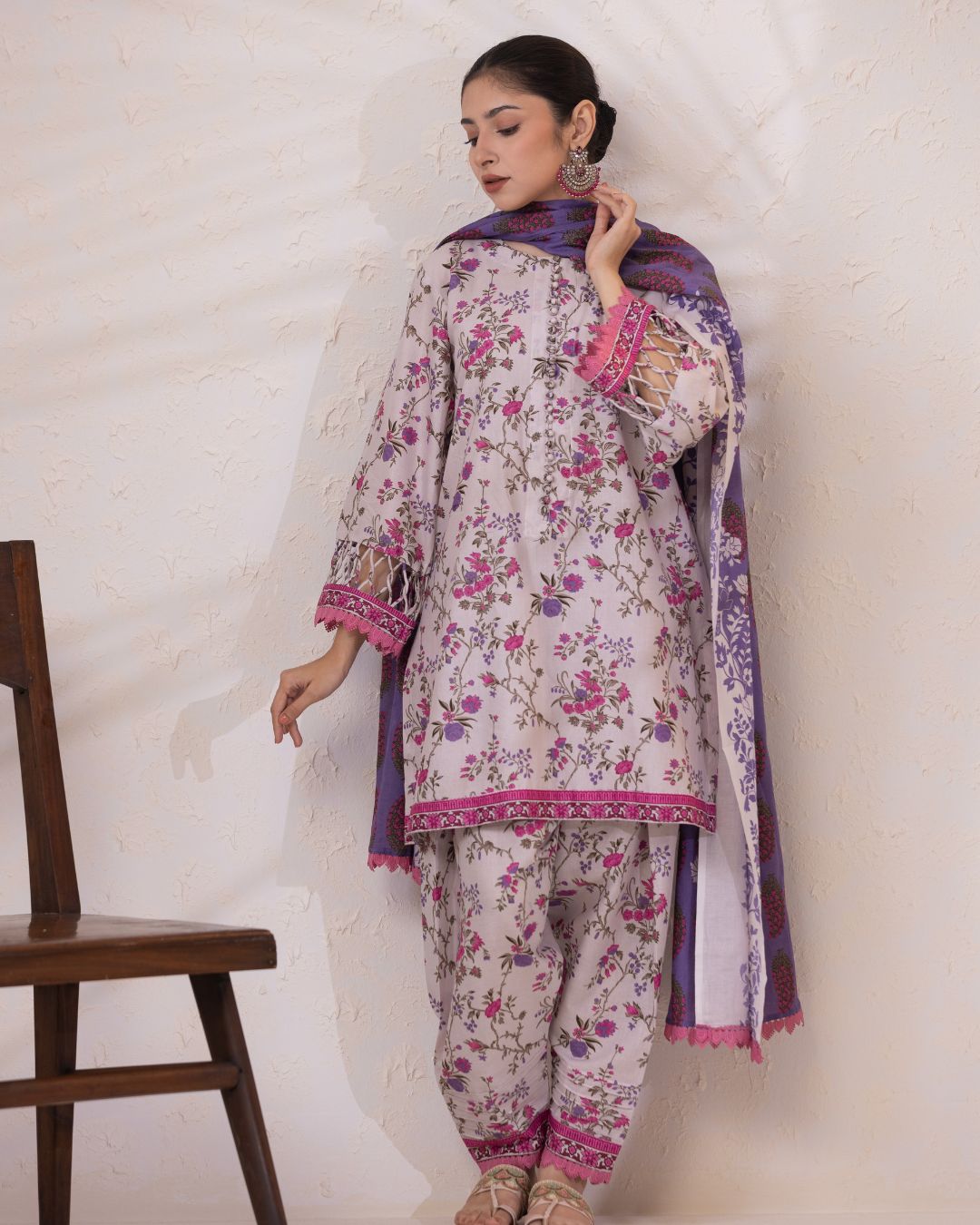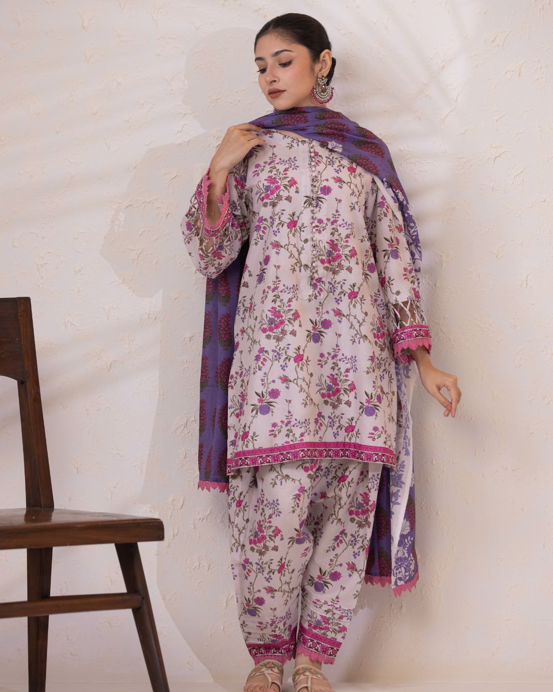 Details: An elegant rotary-printed lawn set featuring a regular-fit short kameez, printed salwar, and a coordinated printed lawn dupatta, complemented by refined stitching details on the sleeves.