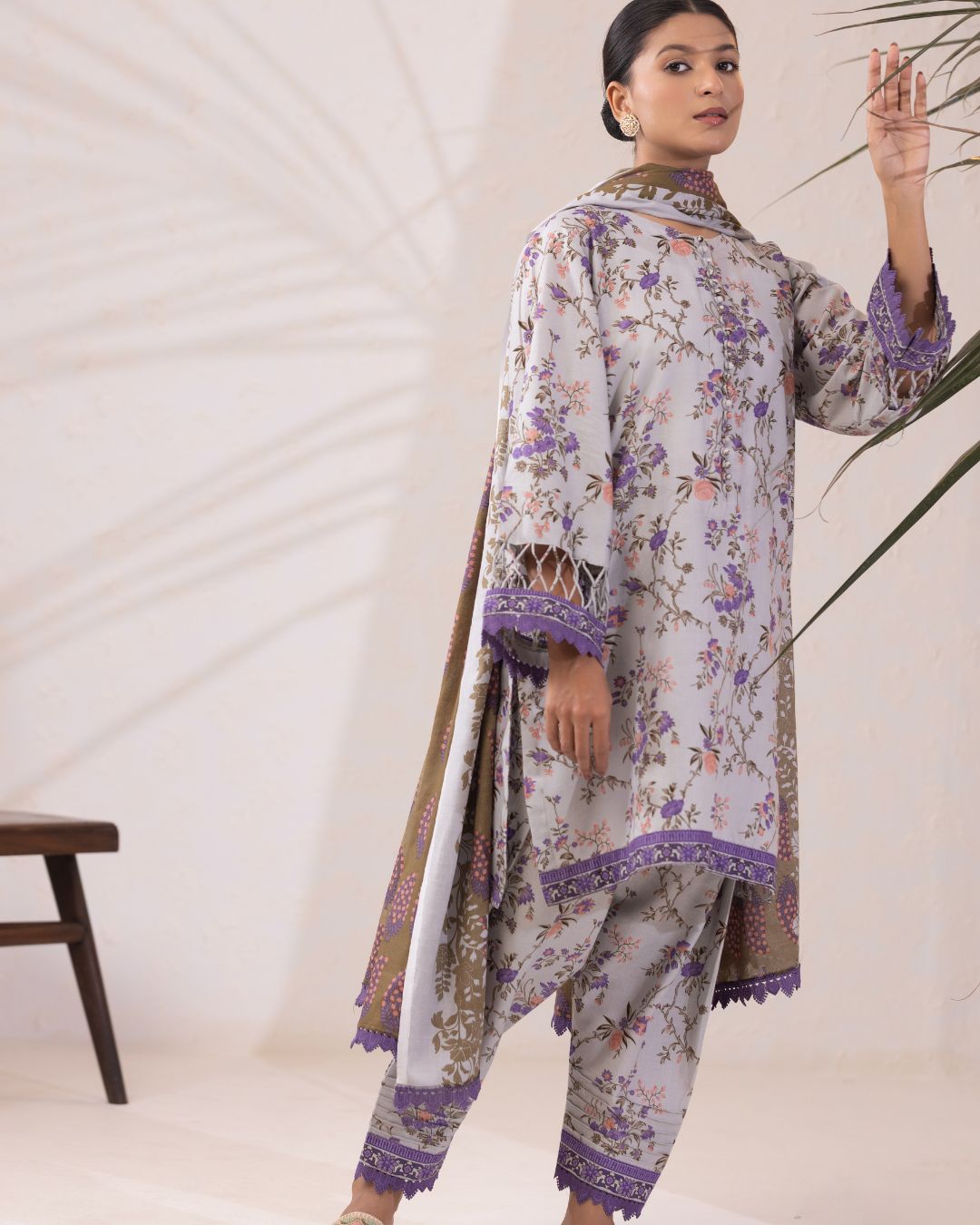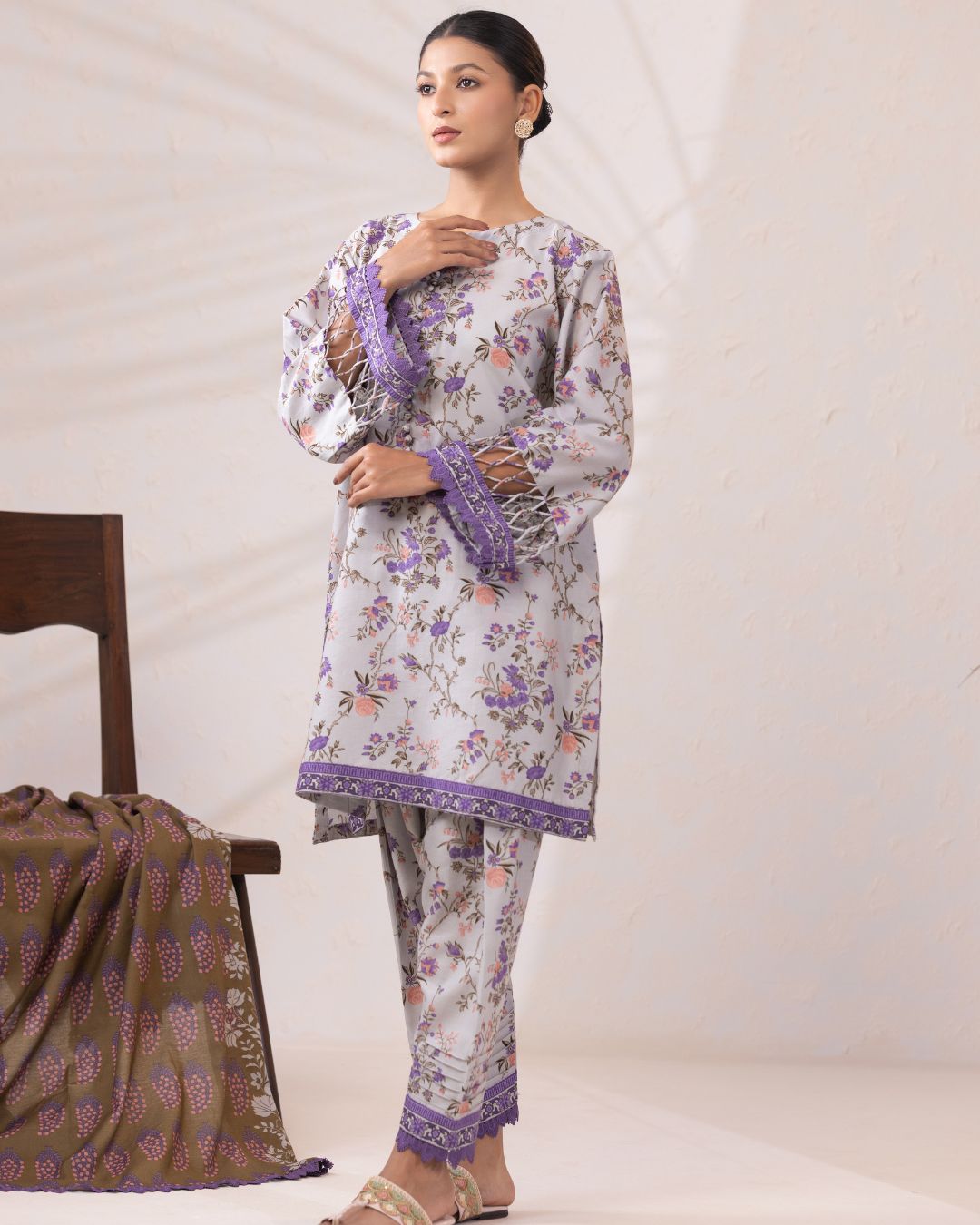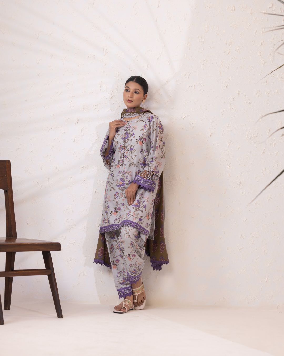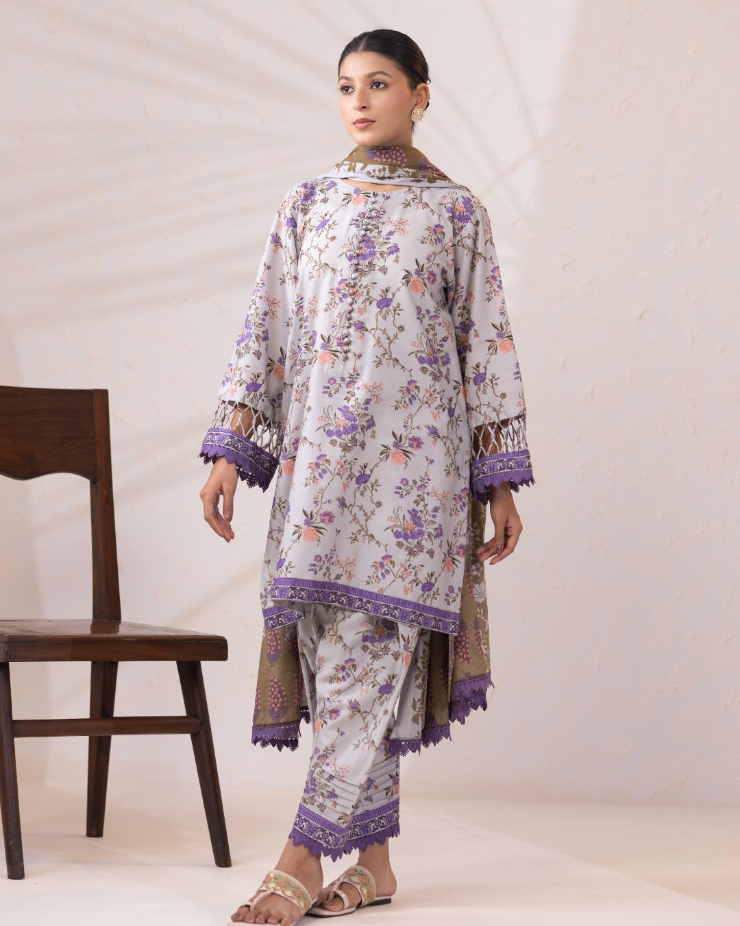 Details: An elegant rotary-printed lawn set featuring a regular-fit short kameez, printed salwar, and a coordinated printed lawn dupatta, complemented by refined stitching details on the sleeves.