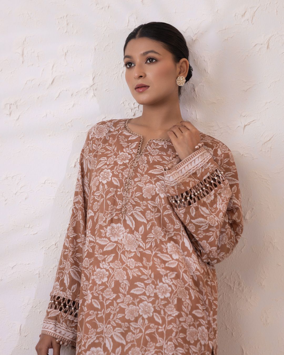 Details: A modern rotary-printed lawn set featuring a regular-fit long -kameez, classic cigarette pants, a soft lawn dupatta, and elegant stitching details on the sleeves.