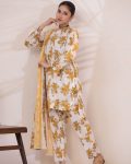 Details: Crafted from breathable rotary-printed lawn, featuring a regular-fit long kameez, straight-cut pants, and an elegant lawn dupatta.