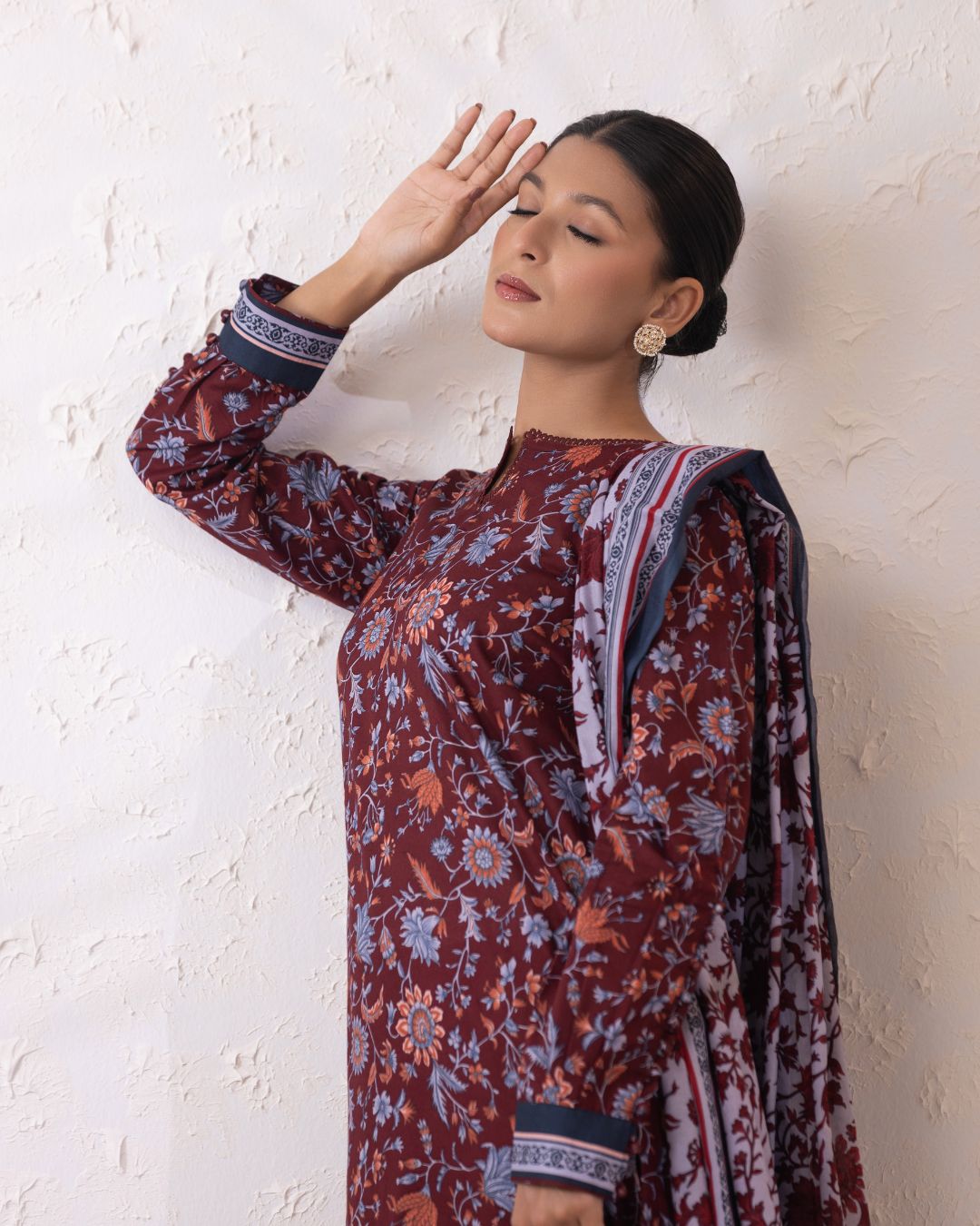Details: Crafted from breathable rotary-printed lawn, featuring a regular-fit kameez with fabric button detailing on the sleeves, straight-cut printed pants, and a coordinated lawn dupatta.