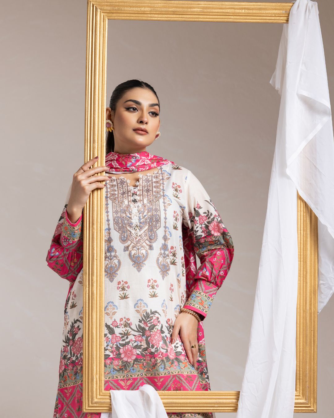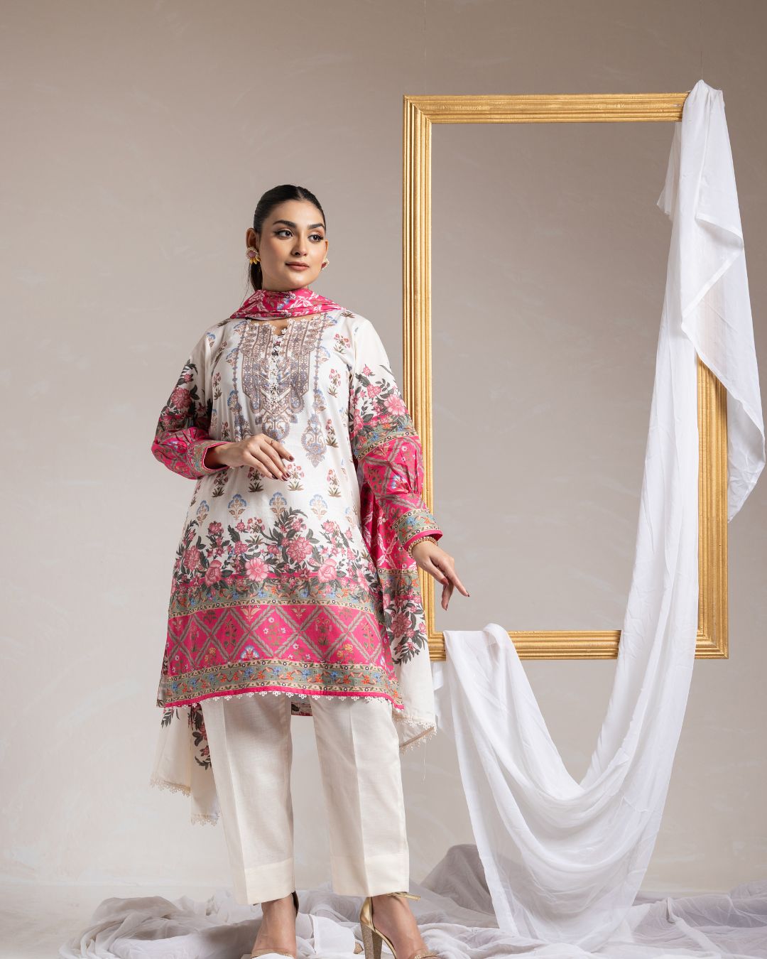 Details: Regular fit mid length kameez paired with straight pants and a lightweight contrasting lawn dupatta, offering a breathable and effortlessly elegant.