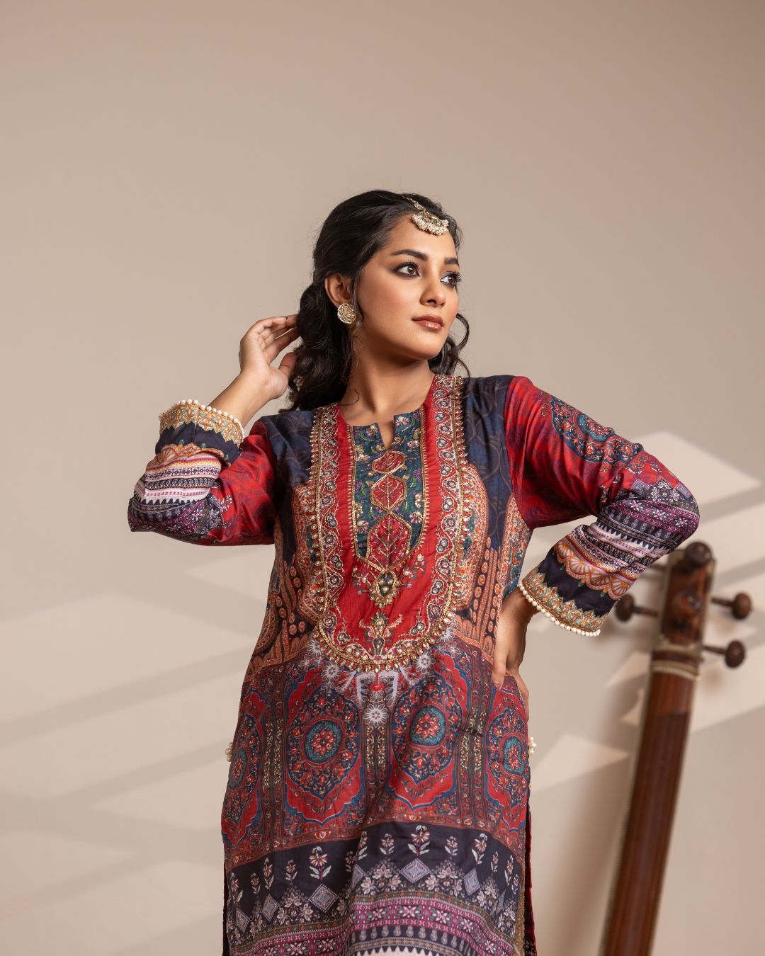 Details: Experience timeless elegance with our regular long kameez, perfectly paired with straight pants for a chic everyday look. The addition of exquisite kurcupi embroidery adds a touch of bling, elevating this ensemble. Ideal for both casual outings and more polished occasions, this outfit seamlessly combines comfort with style, making it a versatile choice for any wardrobe.