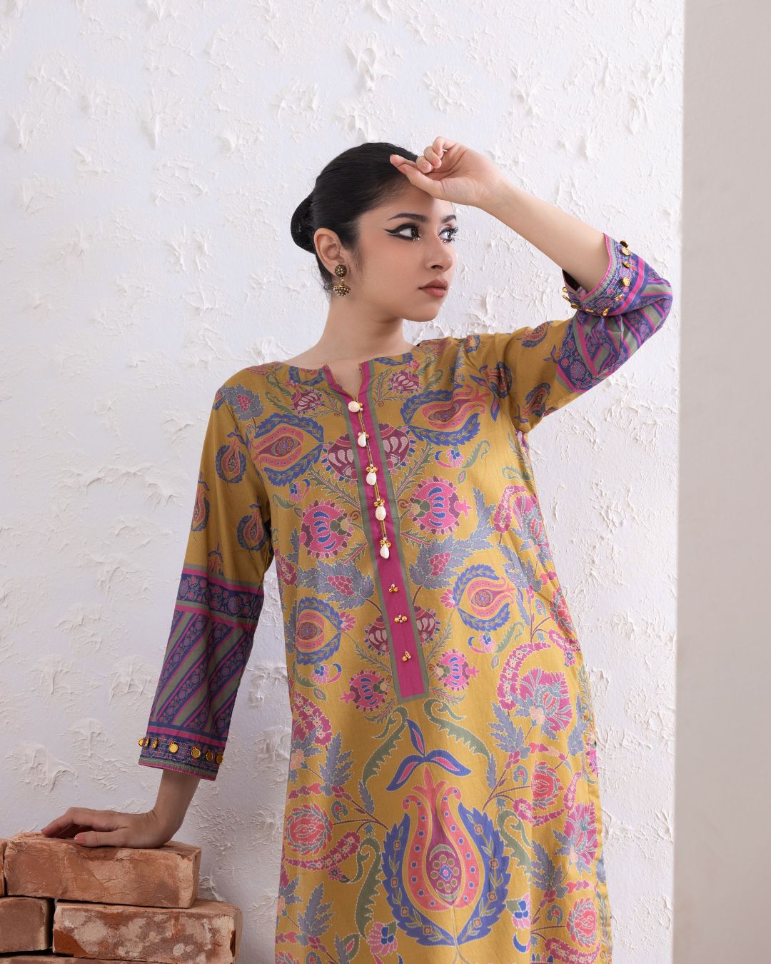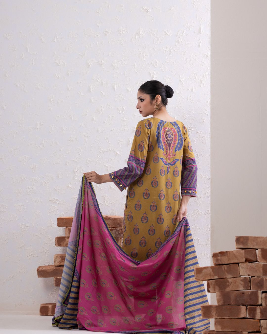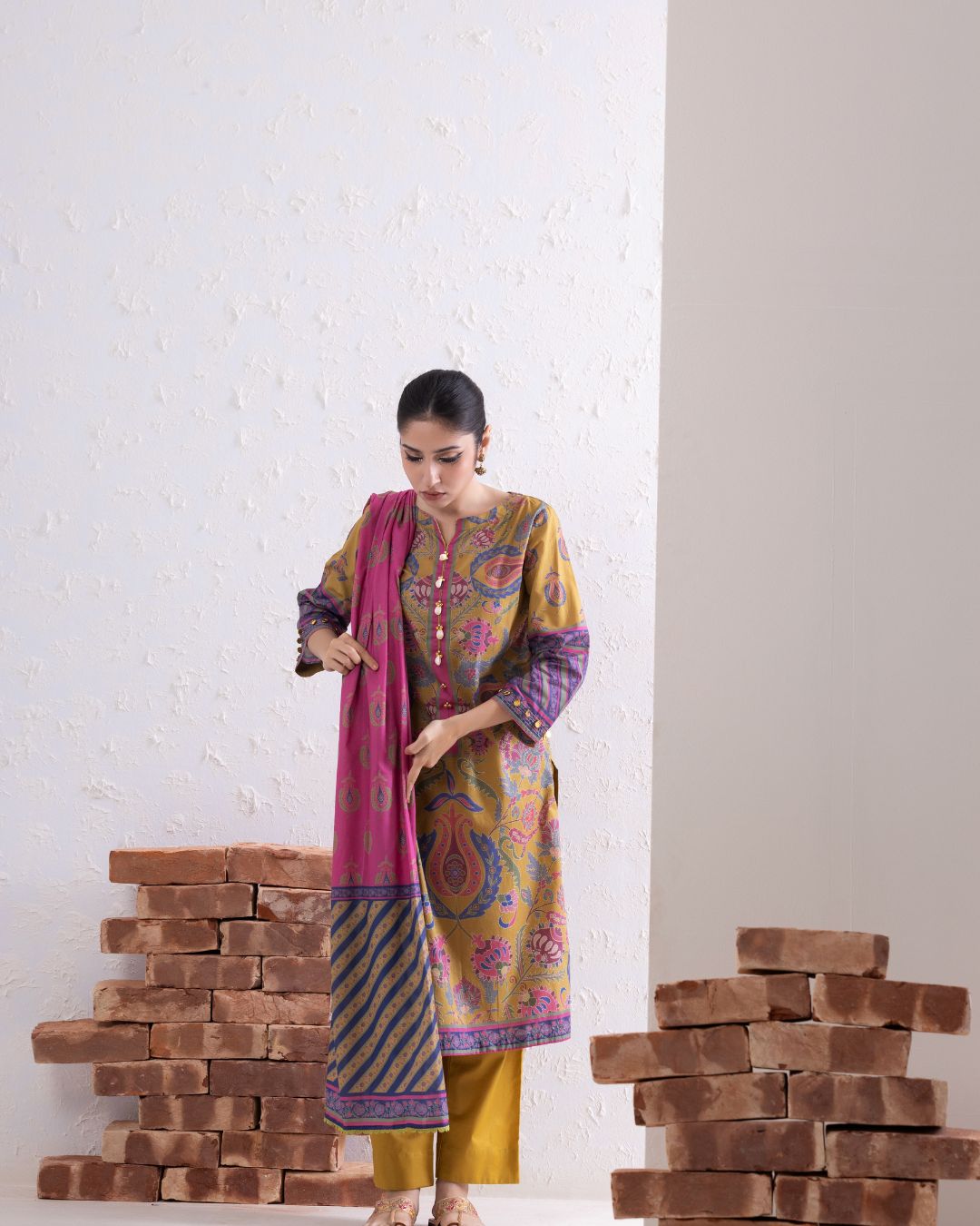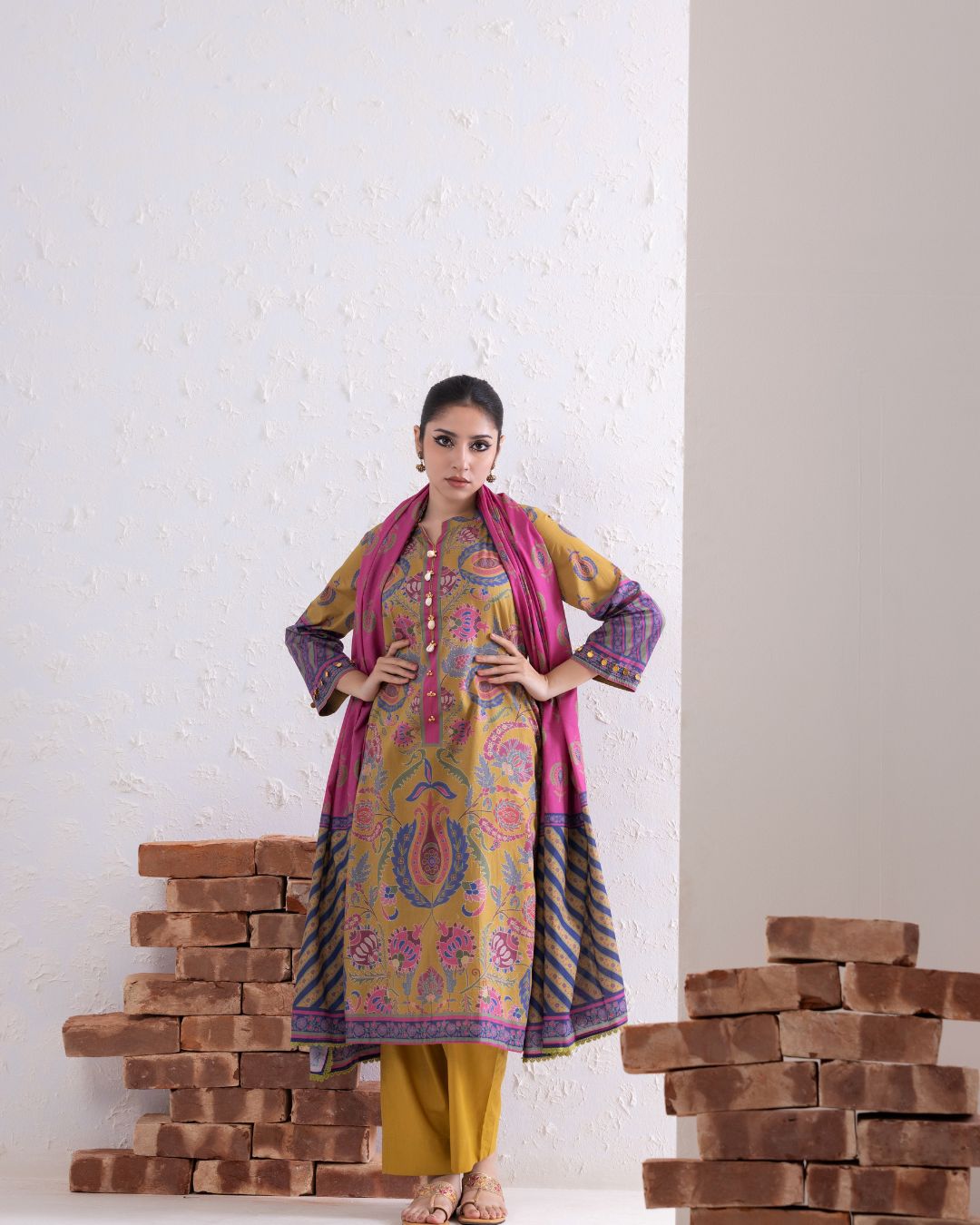 Details: A classic 3-piece digital printed lawn ensemble featuring a regular-fit kameez, straight-cut pants, and a contrasting lawn dupatta.