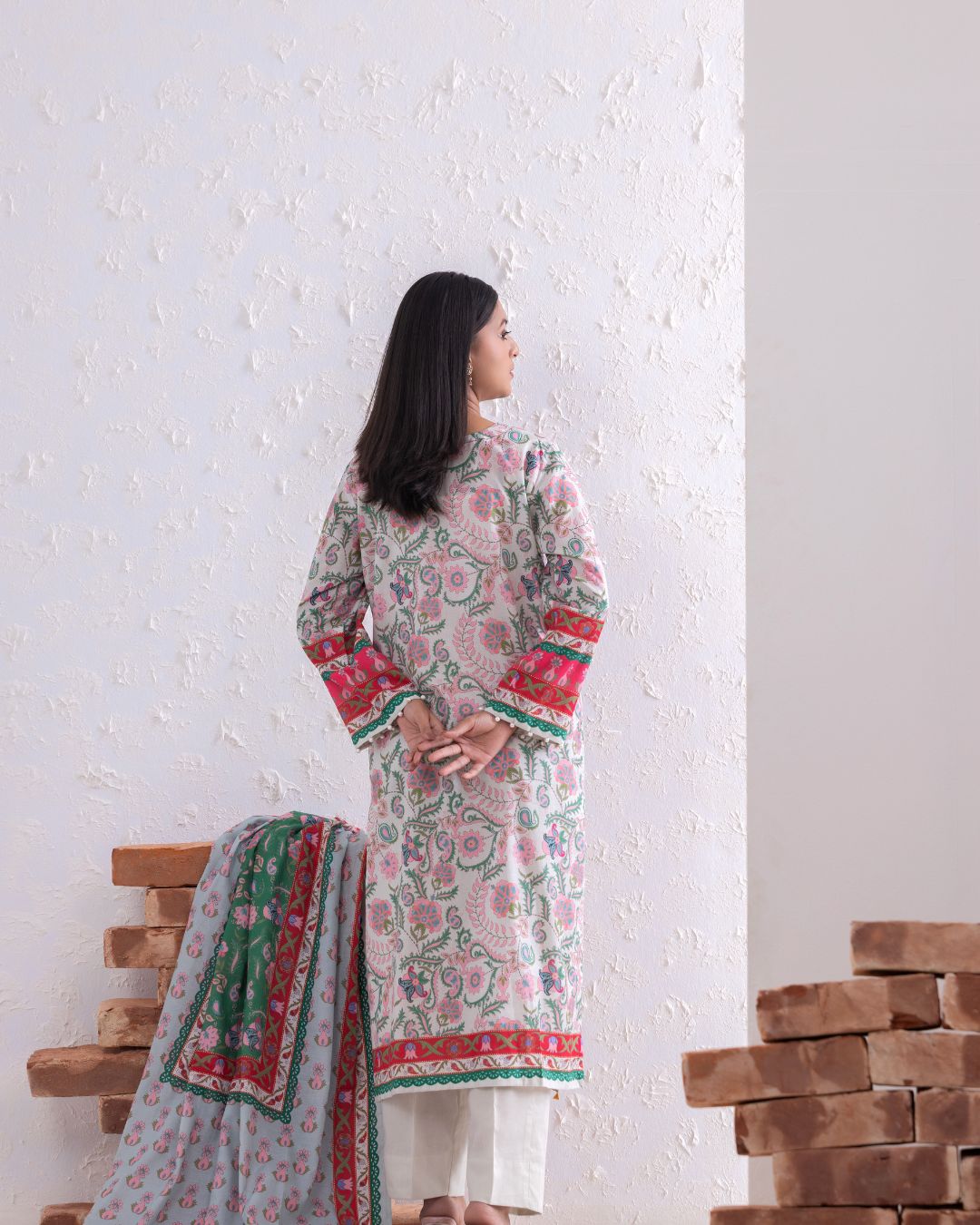 Details: An effortlessly chic digital printed lawn ensemble, pairing a regular-fit kameez with cotton straight-cut pants and a contrasting lawn dupatta.