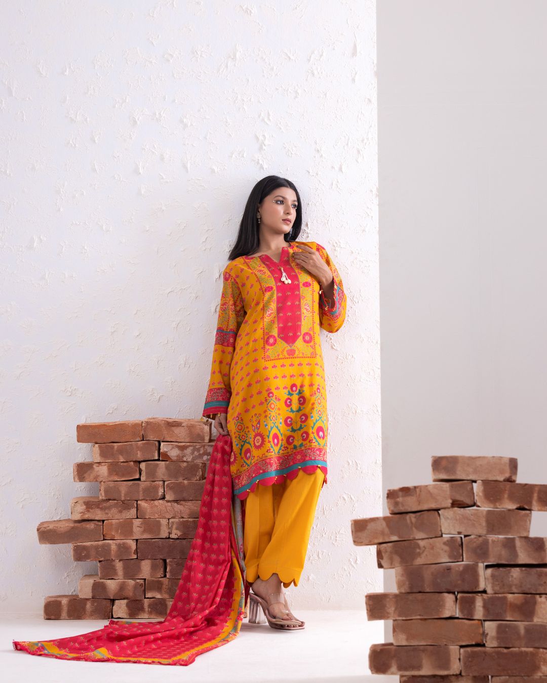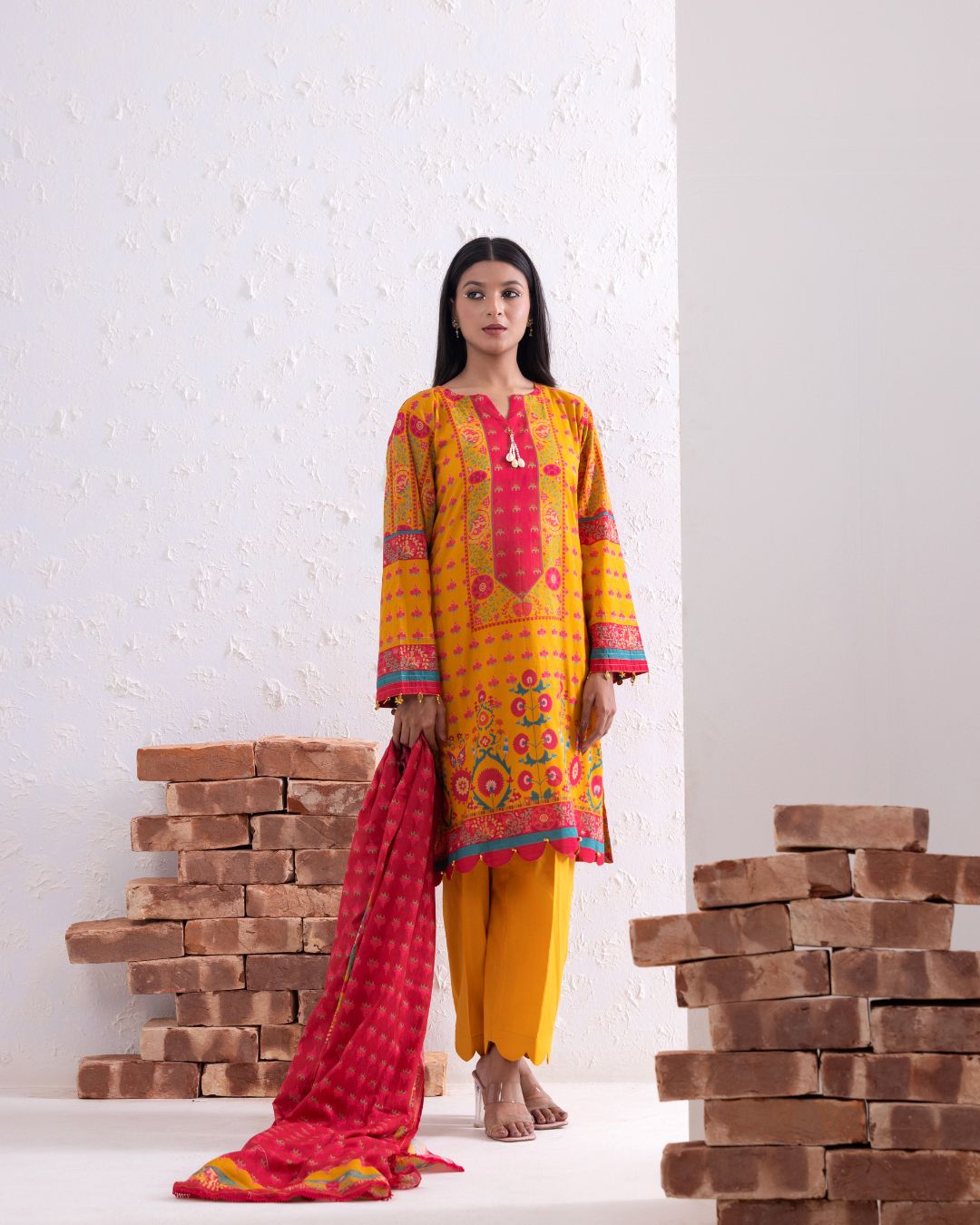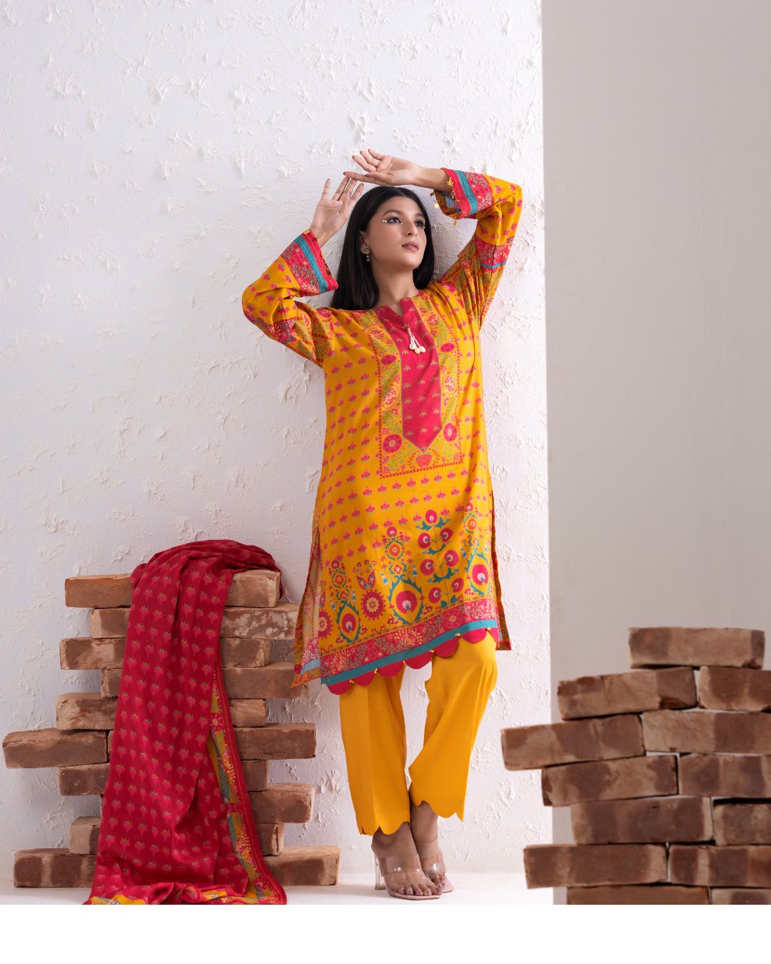 Details: A classic 3-piece digital printed lawn ensemble featuring a short regular-fit kameez, cotton straight-cut pants, and a contrasting lawn dupatta.
